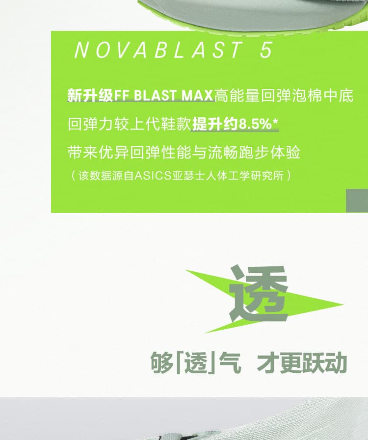 缓震回弹:中底搭载 FF BLAST MAX 泡沫,相较上一代弹跳性能提升8.5%,提供柔软着陆感与充沛能量反馈,8毫米跟差助力自然跑姿。