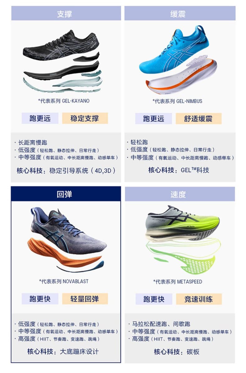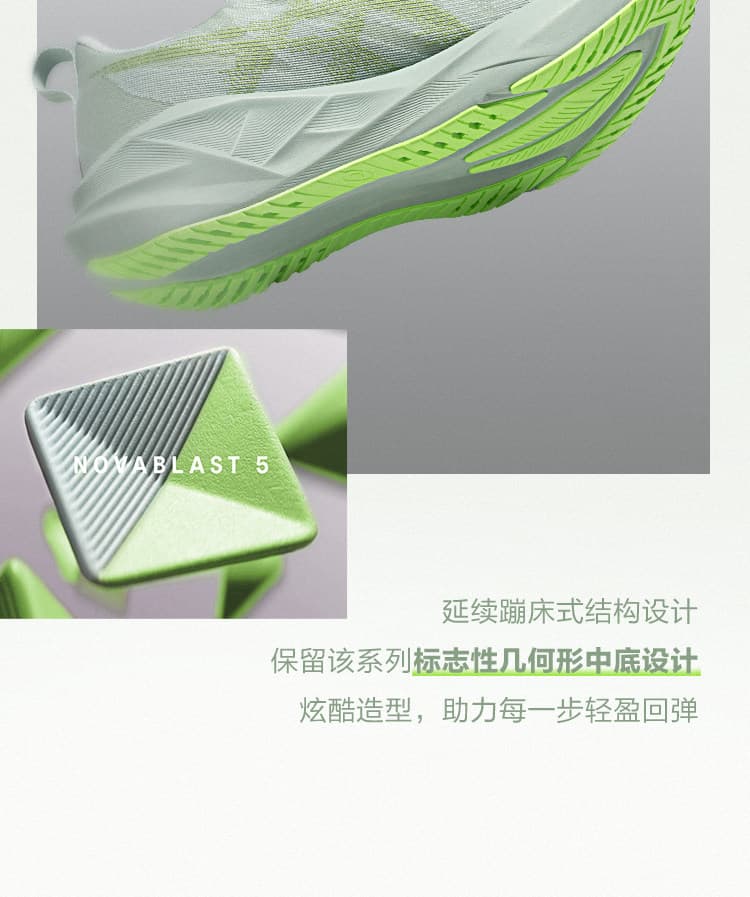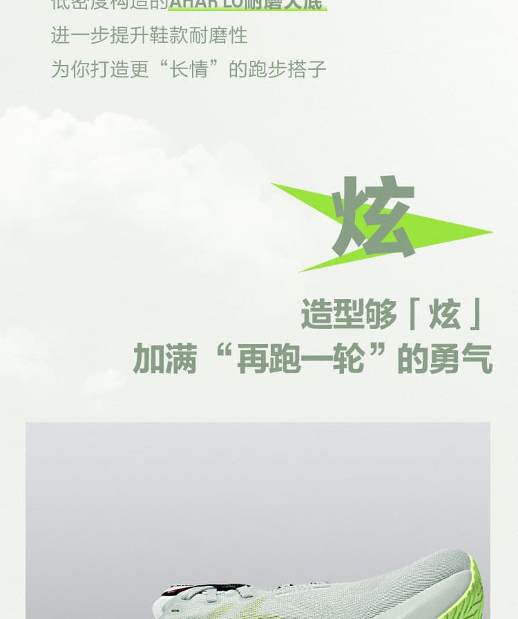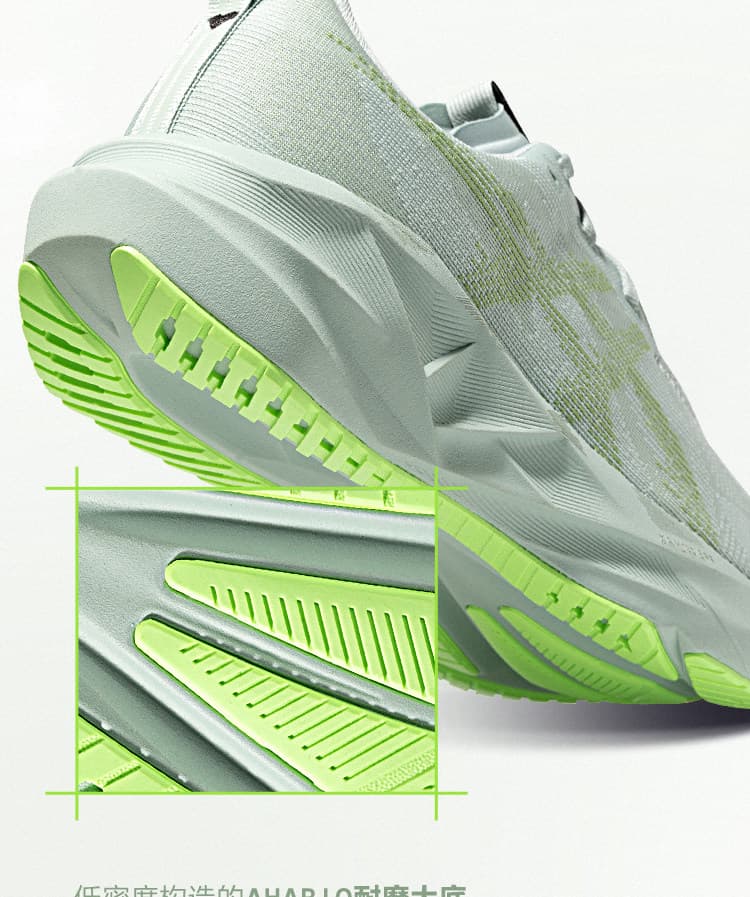 稳定耐磨:外底采用蹦床启发式几何设计,搭配 AHARPLUS 耐磨橡胶,兼具反弹推进力与耐磨性,适配多种路面;加宽中底平台提升长距稳定性。