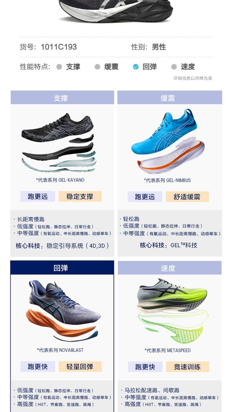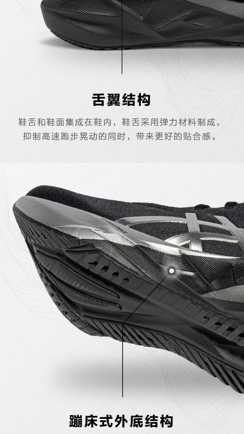 稳定耐磨:外底采用蹦床启发式几何设计,搭配 AHARPLUS 耐磨橡胶,兼具反弹推进力与耐磨性,适配多种路面;加宽中底平台提升长距稳定性。
