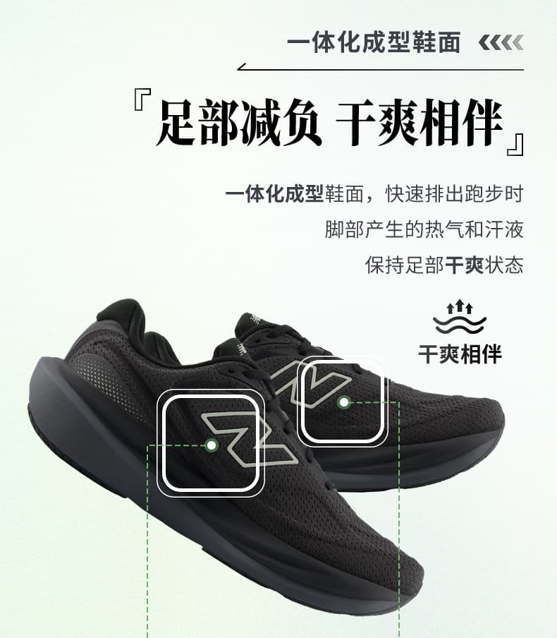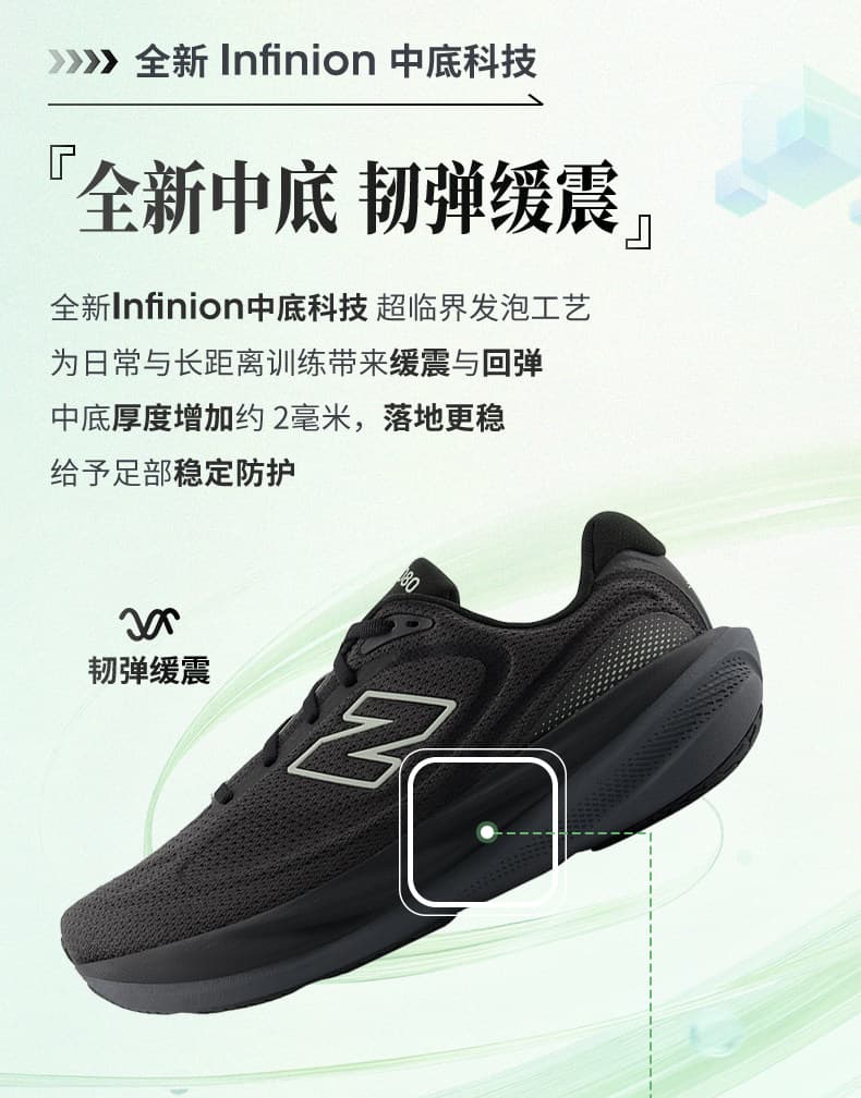 ?中底革新?:搭载Infinion超临界发泡材料,较前代Fresh Foam X减重约40克(43码单只261克),同时中底厚度增加2mm(后跟39.9mm/前掌33.9mm),实现?缓震与回弹的平衡?,适配15-20公里长距离训练。?