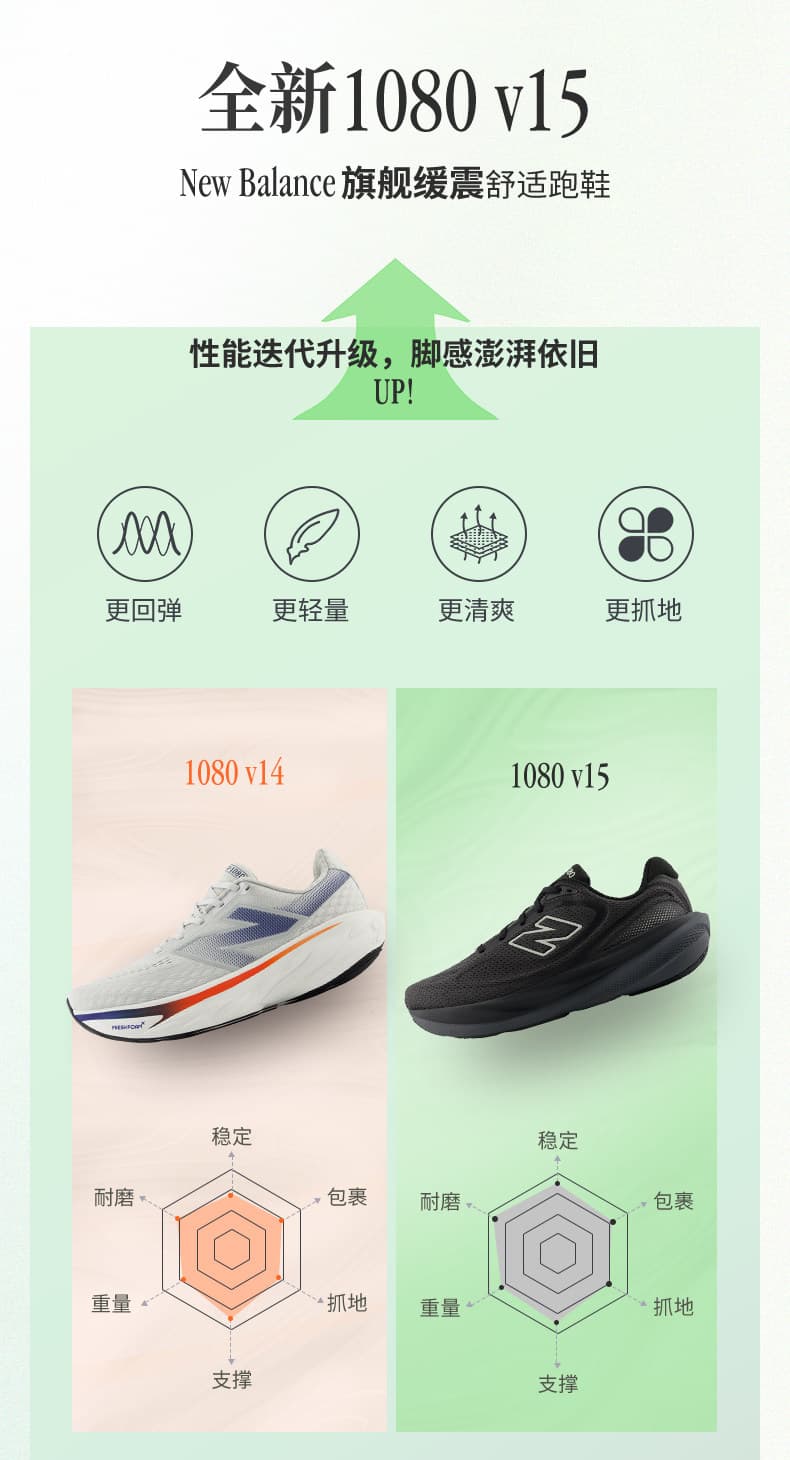 New Balance 1080v15 是品牌2026年旗舰缓震跑鞋,采用全新 Infinion 中底技术,主打轻量化与能量回弹,适合日常训练及长距离跑步