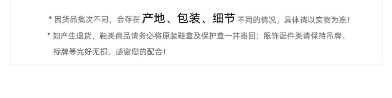 2)七天退换保障:自您签收商品后7天内,因尺码不合适,货品外观大小,颜色,形状的感受偏差,订购错误等,在商品未使用、未拆毁包装、未剪掉或丢失吊卡说明书等不影响二次销售的情况下,可以为您退换商品(下文中说明的不能退换的商品除外)。