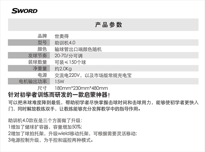 SWORD世奥得 乒乓球助训机4.0 乒乓球训练发球机 便携陪练器 乒乓球自动发球助训机四代 四色可选