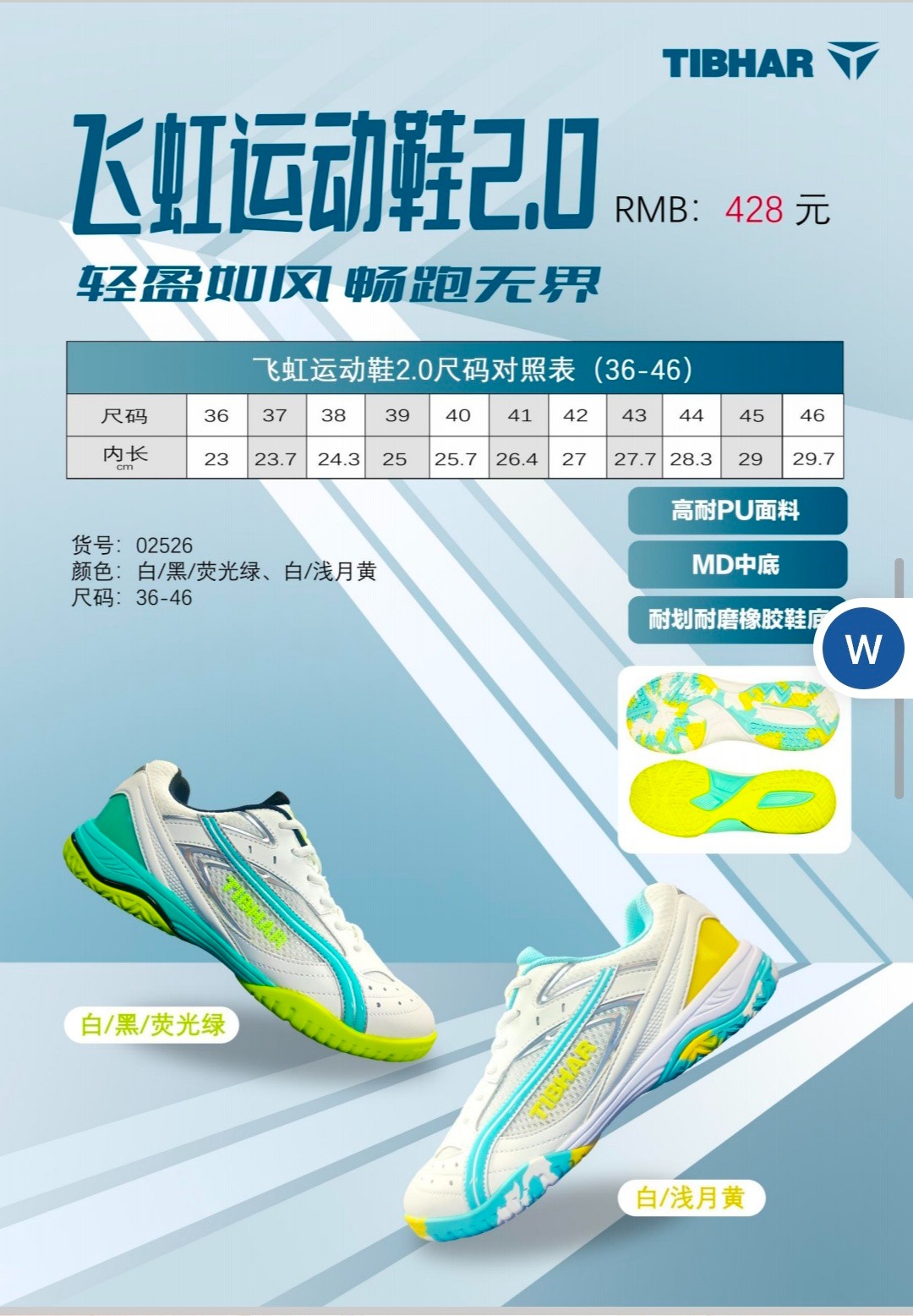 TIBHAR挺拔 乒乓球鞋 飞虹2.0乒乓球运动鞋 02526 专业乒乓球鞋 白/黑/荧光绿