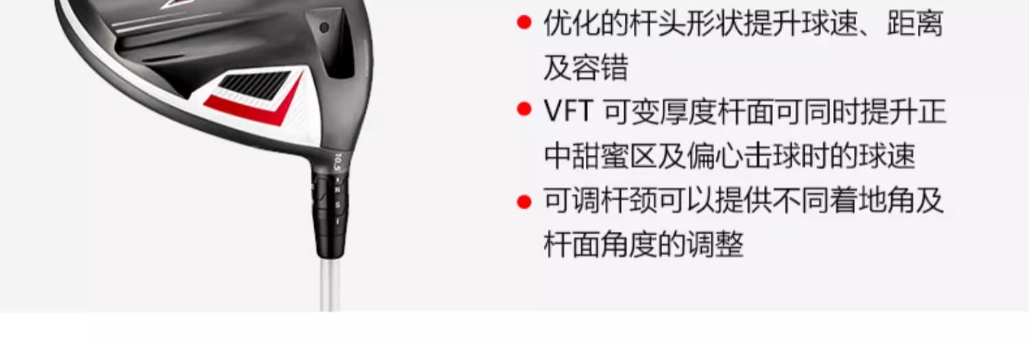 VFT 可变厚度杆面可同时提升正中甜蜜区及偏心击球时的球速可调杆颈可以提供不同着地角及杆面角度的调整