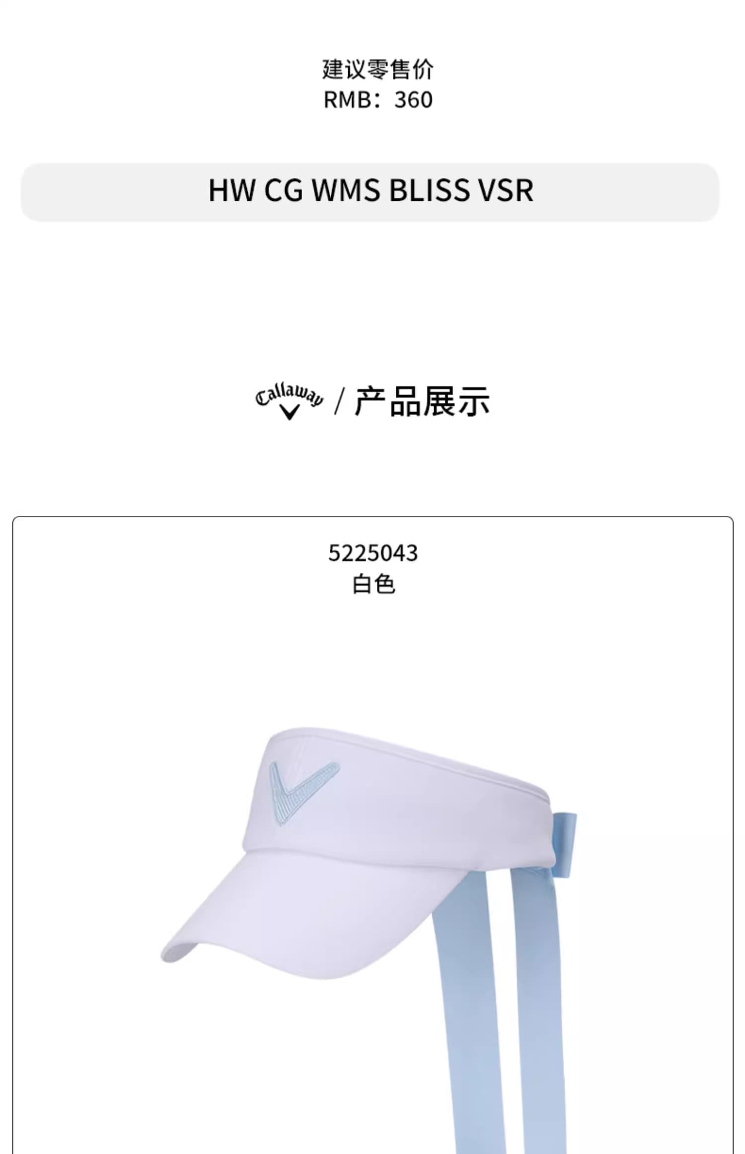 Callaway卡拉威 高尔夫帽子 BLISS VSR女士无顶帽运动遮阳帽高尔夫帽 粉白色/白蓝色