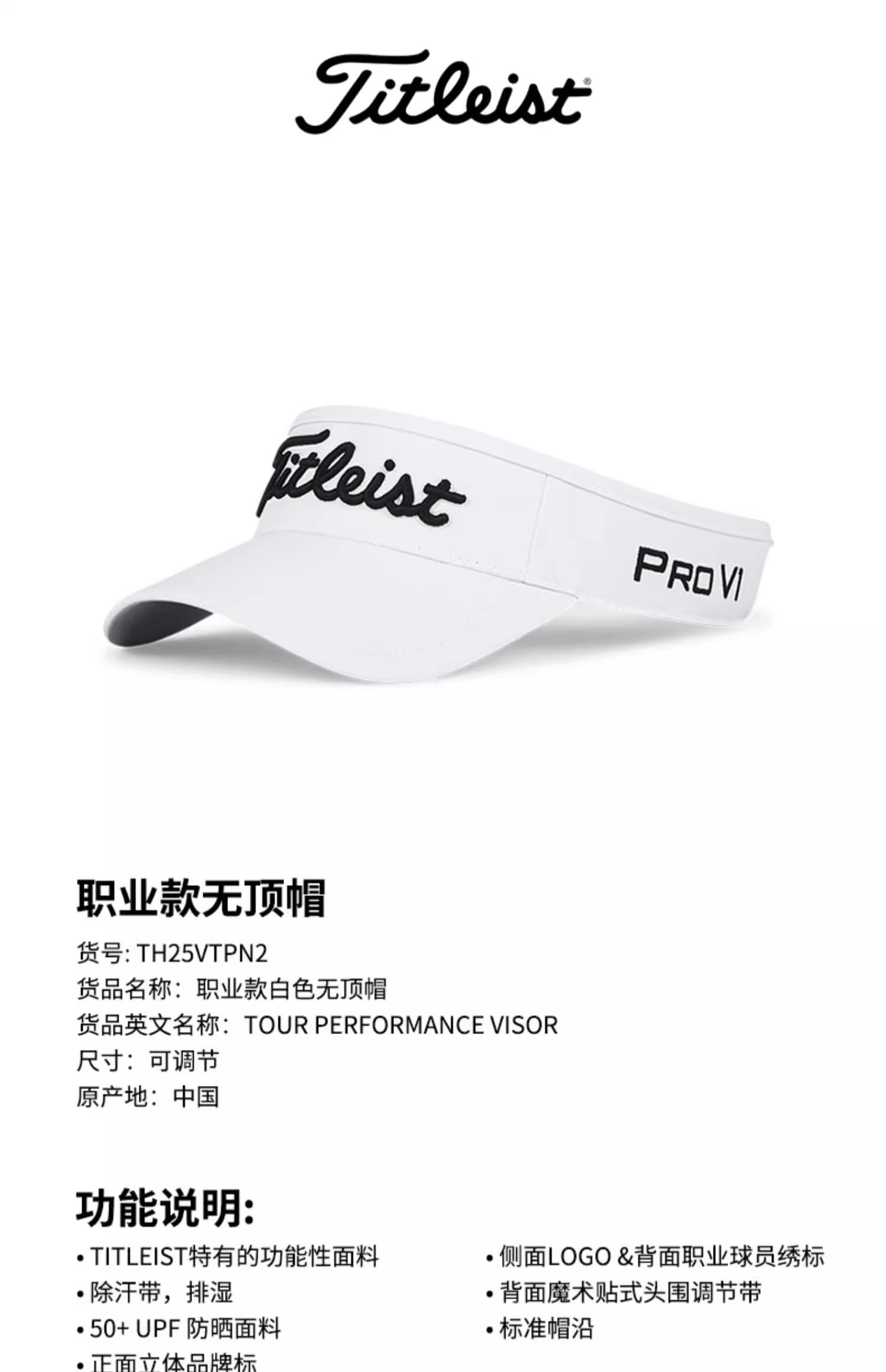 Titleist泰特利斯 高尔夫球帽 男TP职业可调节运动遮阳防晒帽鸭舌帽无顶帽 TH25VTPN2 多色可选