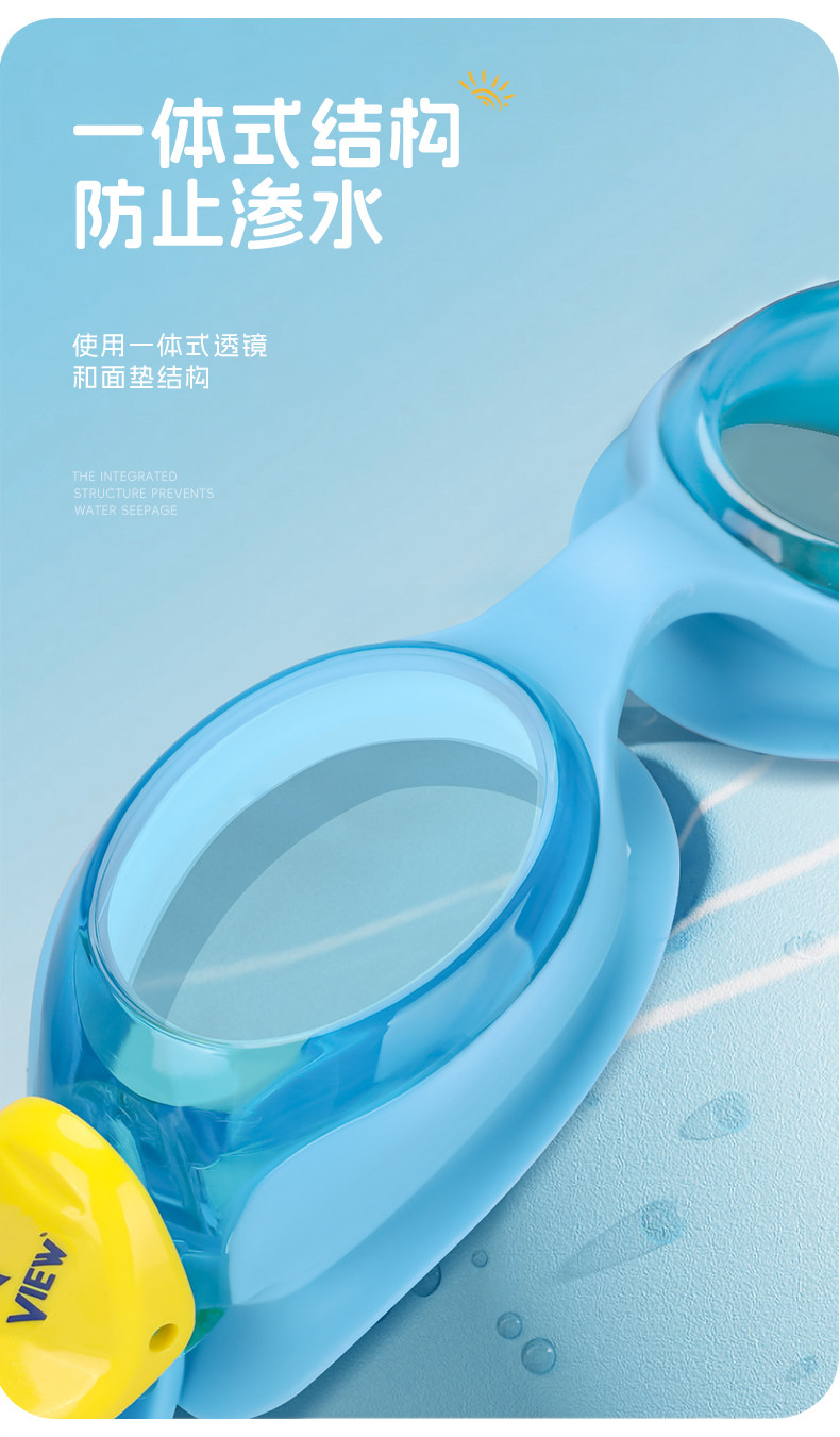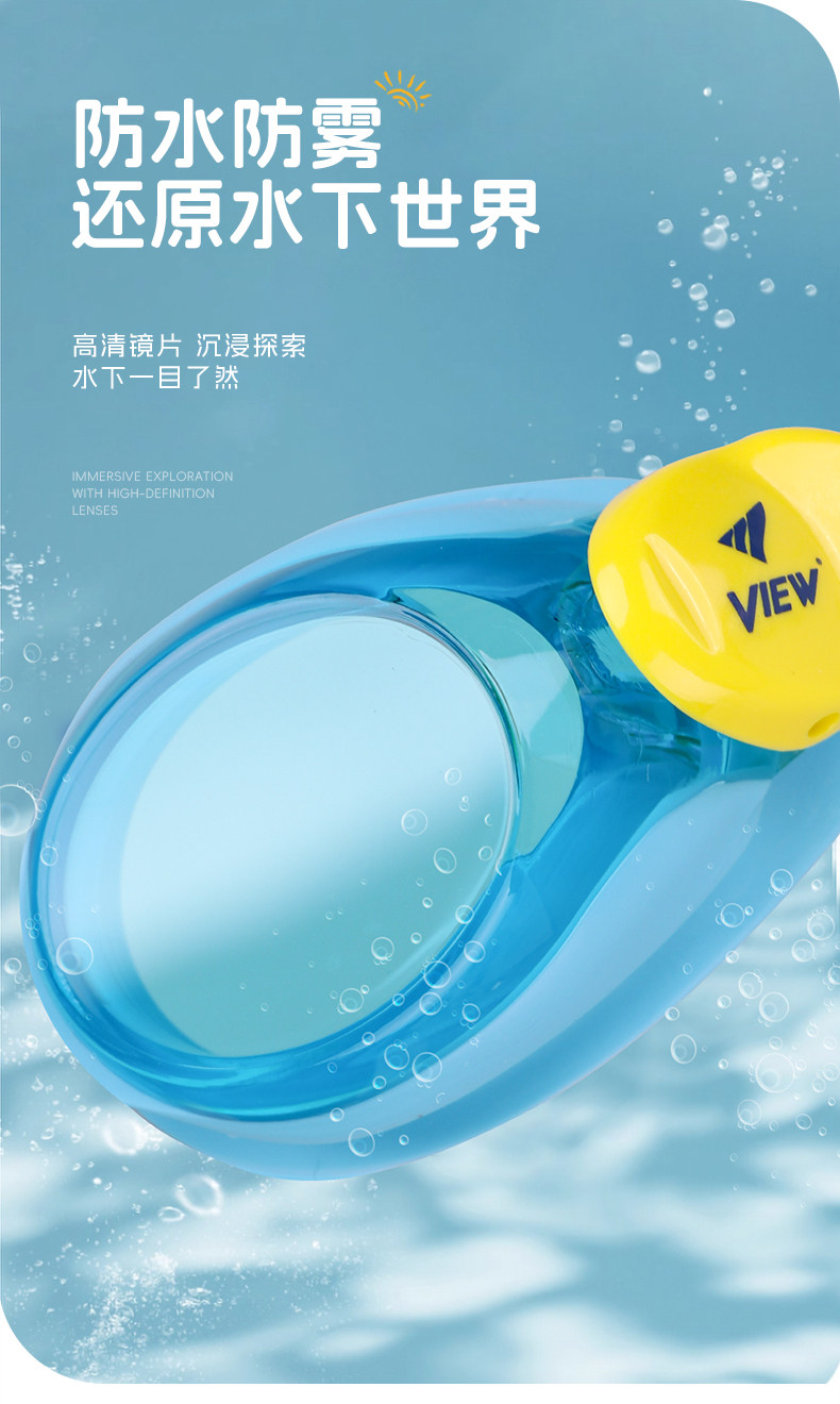 镜片搭载 VIEW 专属防雾技术,高清透光不模糊,兼具 UV 防护与耐磨抗刮性能;镜片面垫一体化设计 + ??软弹性体材质,紧密贴合幼儿脸型,防水防漏不压痕;棘齿式卡扣方便家长快速调节头带松紧,适配不同头围。