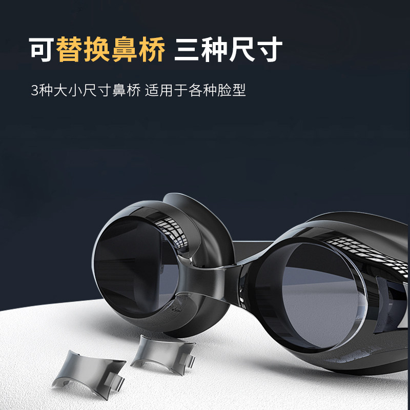 多度数可选(常规平光-1000度,支持左右眼不同度数定制),高清光学镜片还原真实视野;搭载专业防雾技术,长效保持视野通透;硅胶亲肤面垫+可调节头带,贴合面部密封不漏水;耐磨聚碳酸酯镜体抗冲击,配备可更换鼻桥,细节实用易打理。