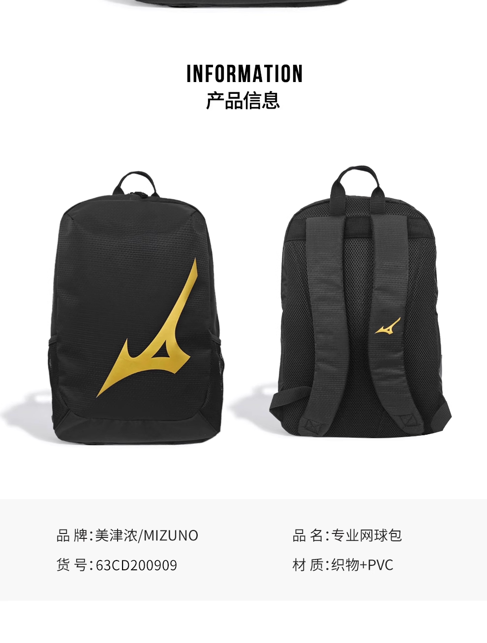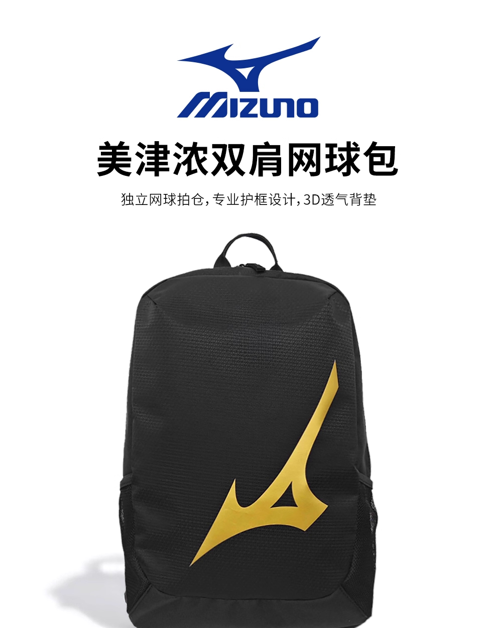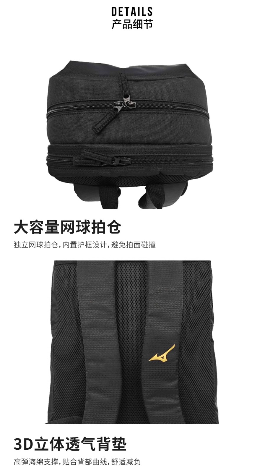 Mizuno美津浓网球包 双肩包男女款大容量运动背包羽毛球网球拍包休闲包 63CD200909 黑色 独立网球拍仓,专业护框设计,3D透气背垫
