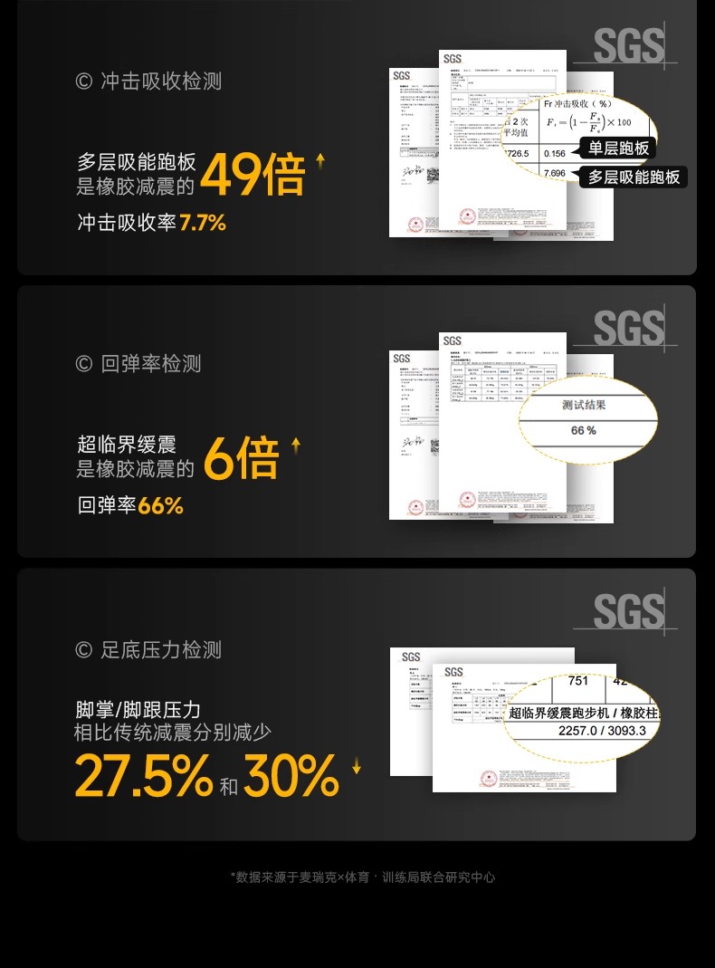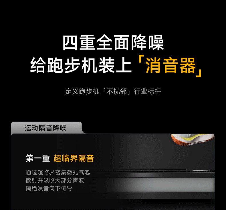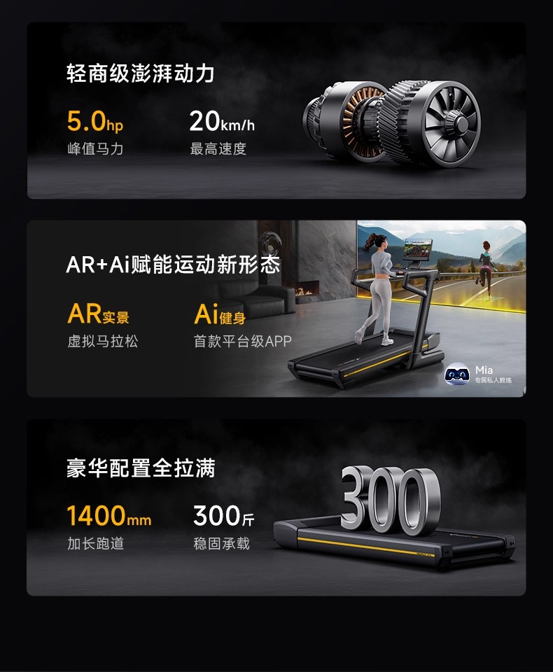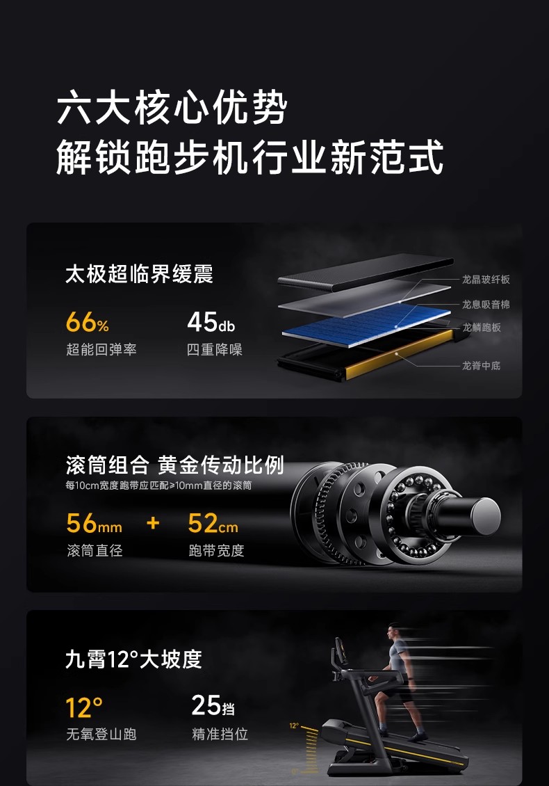 还有EBA 电子刹车系统 保障安全,加粗立柱 + 加厚跑台 实现 0 晃动,300 斤加强承重适配不同身形;