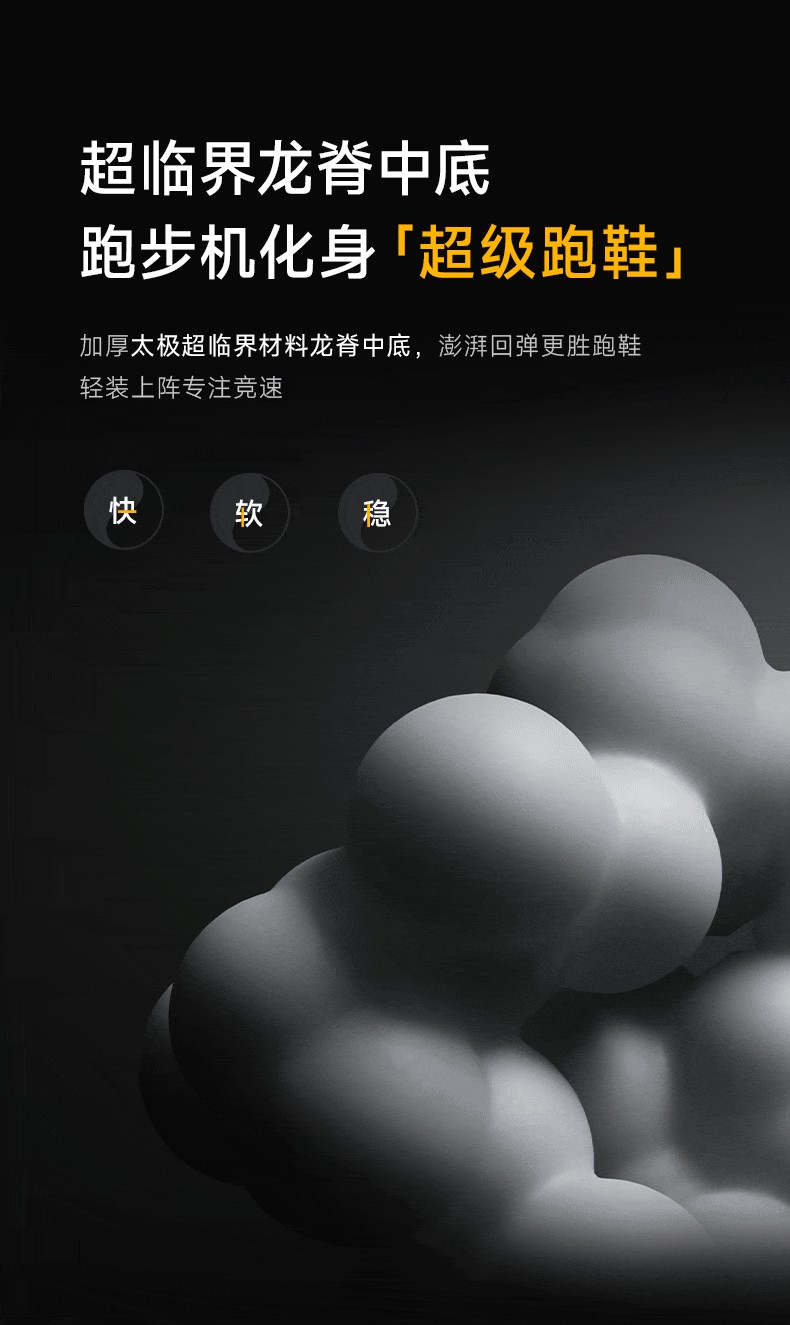 它搭载太极 ? 超临界缓震,配合四重全面缓震降噪,跑起来像踩在云朵上,护膝的同时还能让跑步更安静,深夜运动也不怕打扰家人;