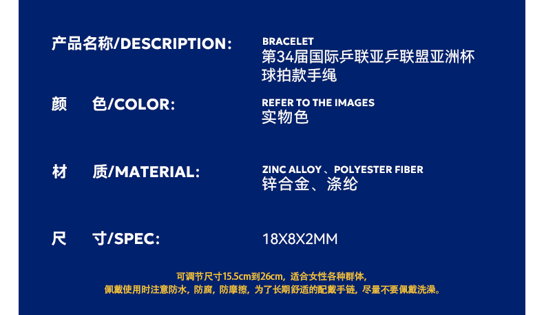 产品名称:第34届国际乒联亚乒联盟亚洲杯球拍款手绳