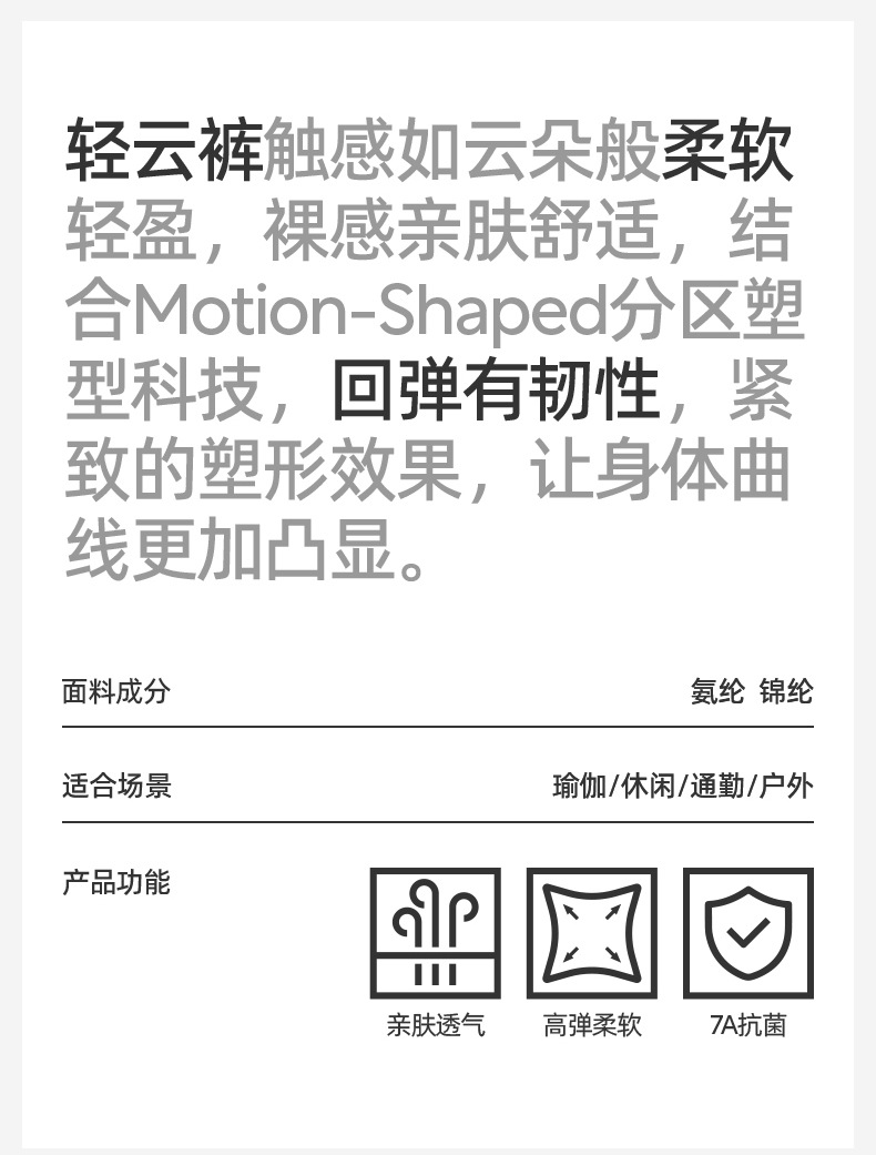 轻云裤触感如云朵般柔软轻盈,裸感亲肤舒适,