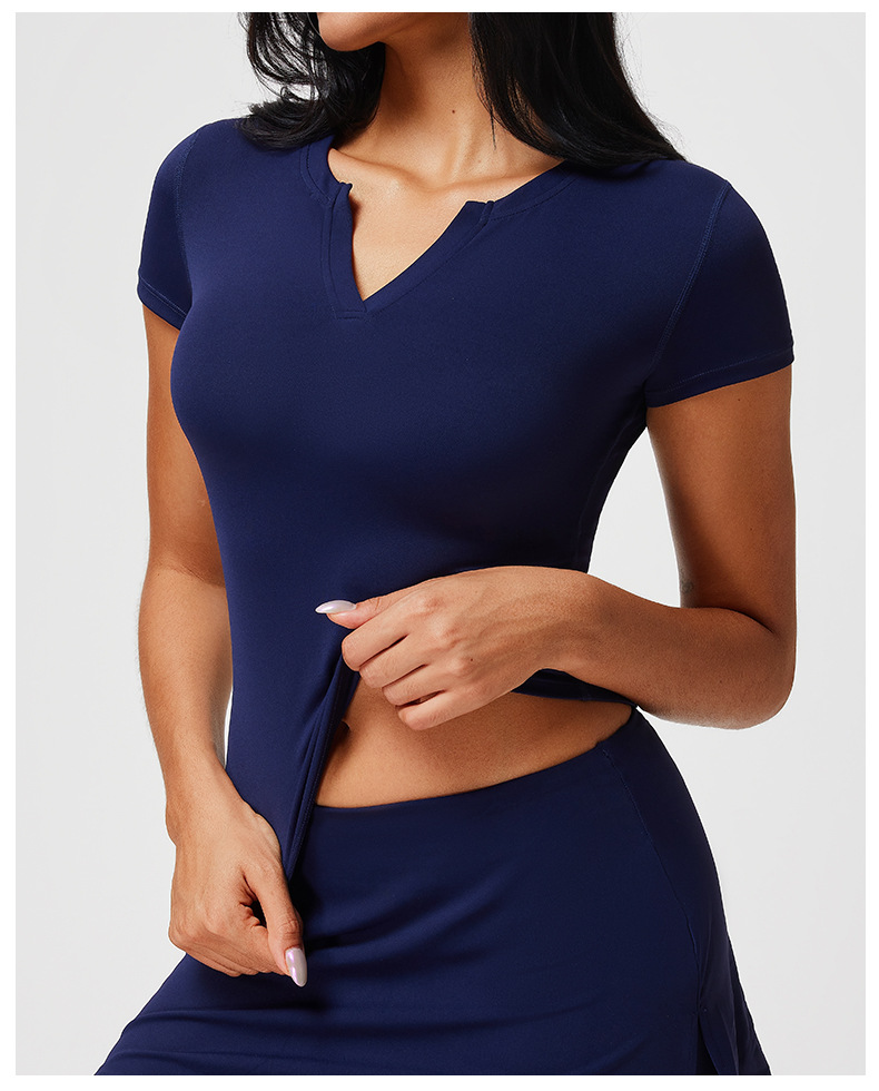 范斯蒂克 V领短袖t恤女 NSRF2504301 藏青蓝 夏荷叶边修身简约百搭运动弹力健身瑜伽上衣 弹力轻盈 柔软顺滑 修身版型