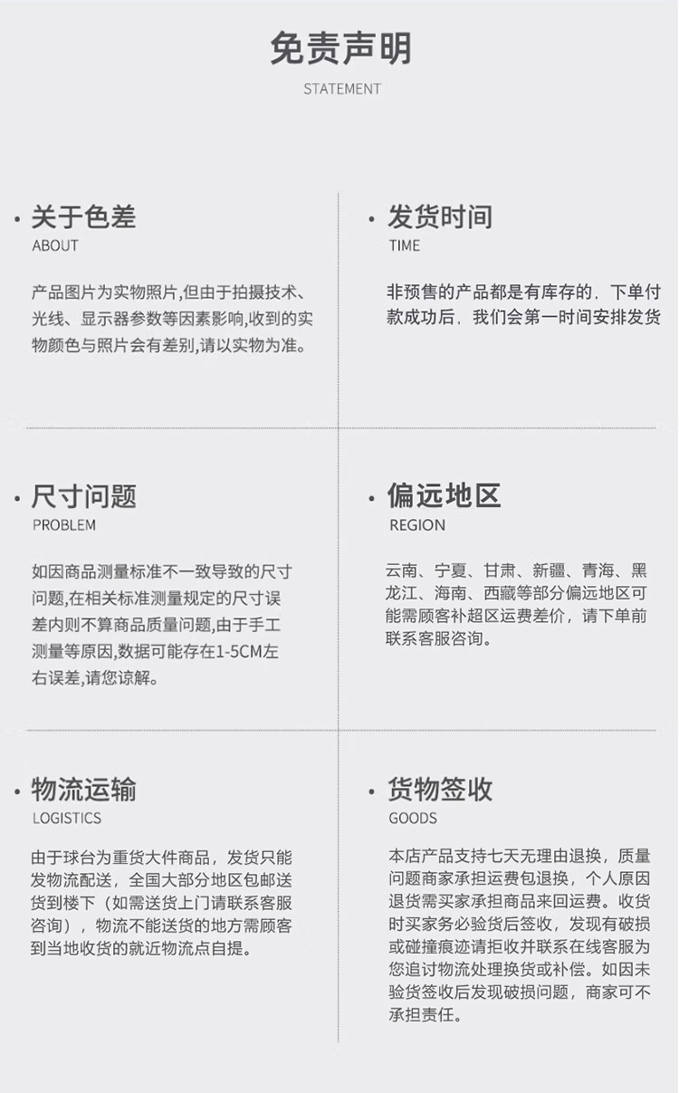 2)七天退换保障:自您签收商品后7天内,因尺码不合适,货品外观大小,颜色,形状的感受偏差,订购错误等,在商品未使用、未拆毁包装、未剪掉或丢失吊卡说明书等不影响二次销售的情况下,可以为您退换商品(下文中说明的不能退换的商品除外)。