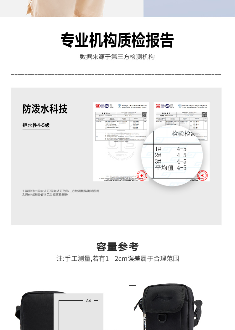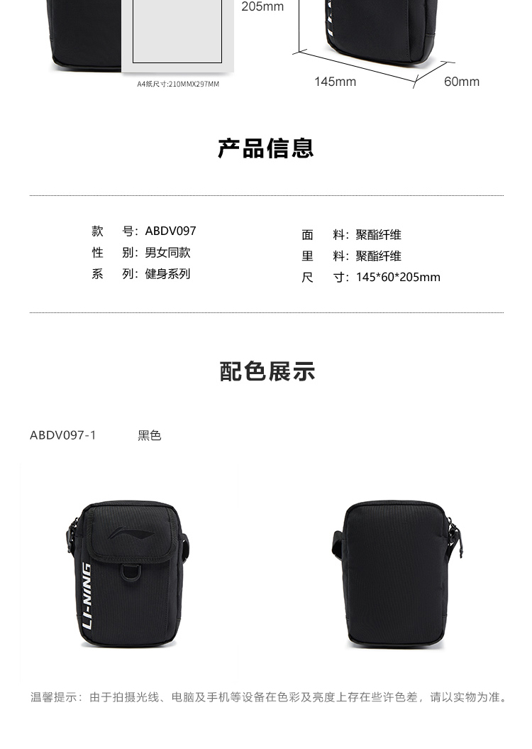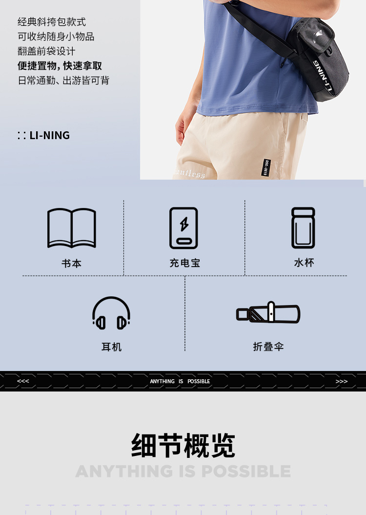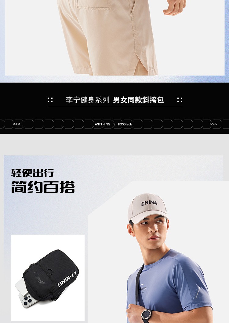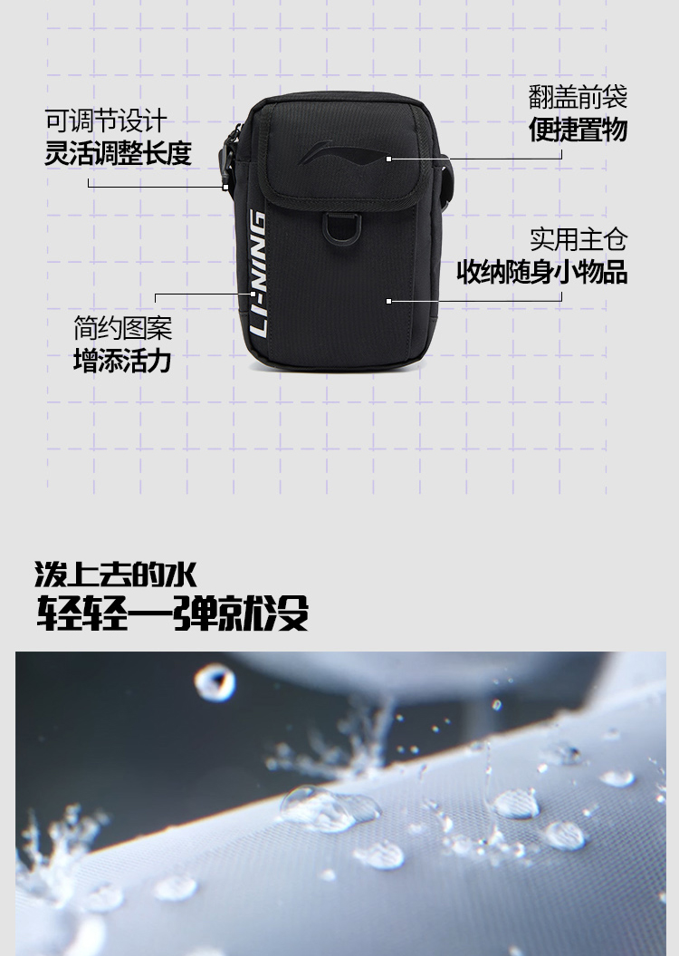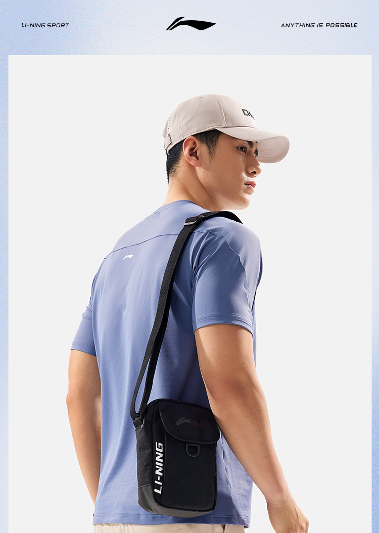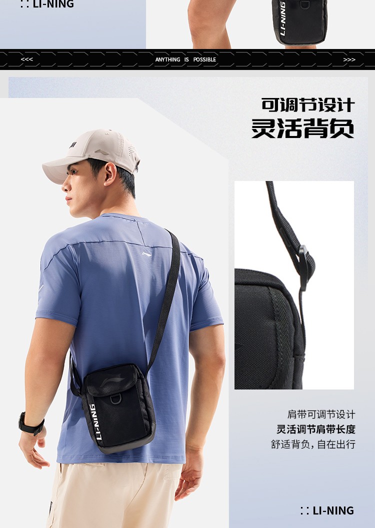 LINING李宁 斜挎包 男女同款单肩包 2025新款健身出行包 便携防泼水运动包 男包女包 ABDV097-1 黑色