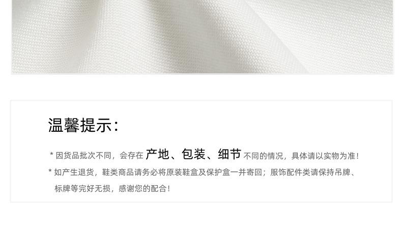 2)七天退换保障:自您签收商品后7天内,因尺码不合适,货品外观大小,颜色,形状的感受偏差,订购错误等,在商品未使用、未拆毁包装、未剪掉或丢失吊卡说明书等不影响二次销售的情况下,可以为您退换商品(下文中说明的不能退换的商品除外)。