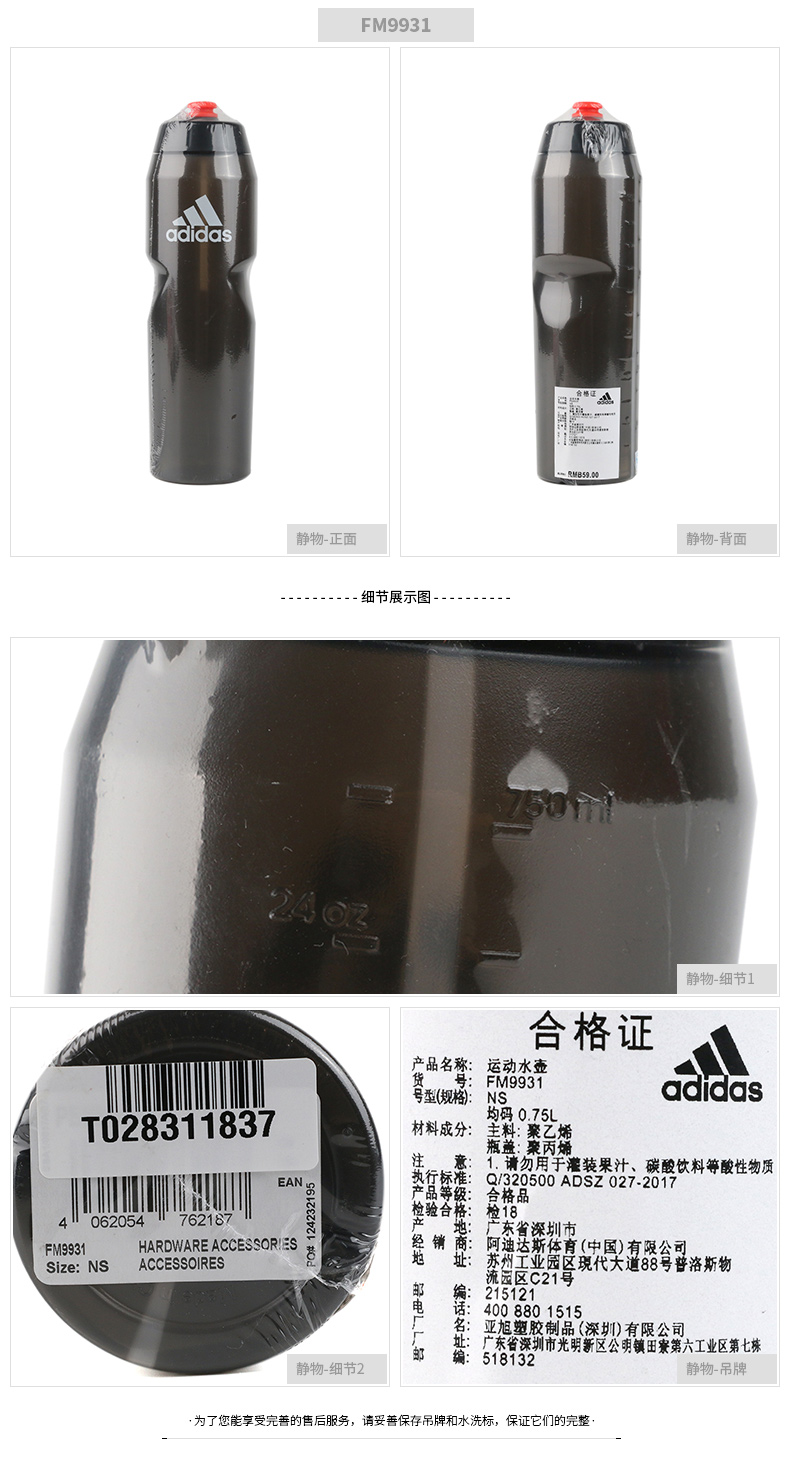 ADIDAS阿迪达斯 运动水壶 跑步水杯 多功能骑行健身水壶 直饮挤压式护具 FM9931 黑色/红荧光