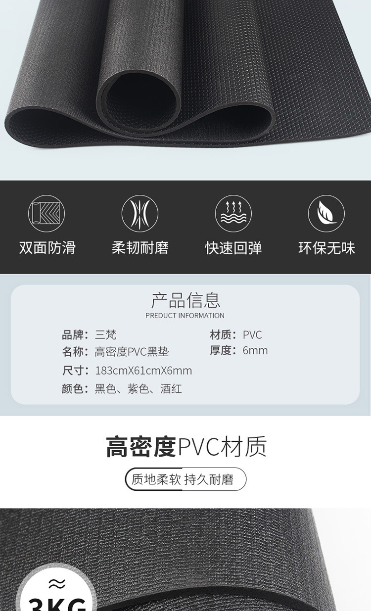 三梵 正品-橡胶垫 6MM青蛙垫 S1A42 183*61*0.6 高密度pvc瑜伽垫 防滑瑜珈垫 健身垫家用跳绳地垫耐用青蛙垫 正面防滑 背面抓地 柔软回弹 防撕裂