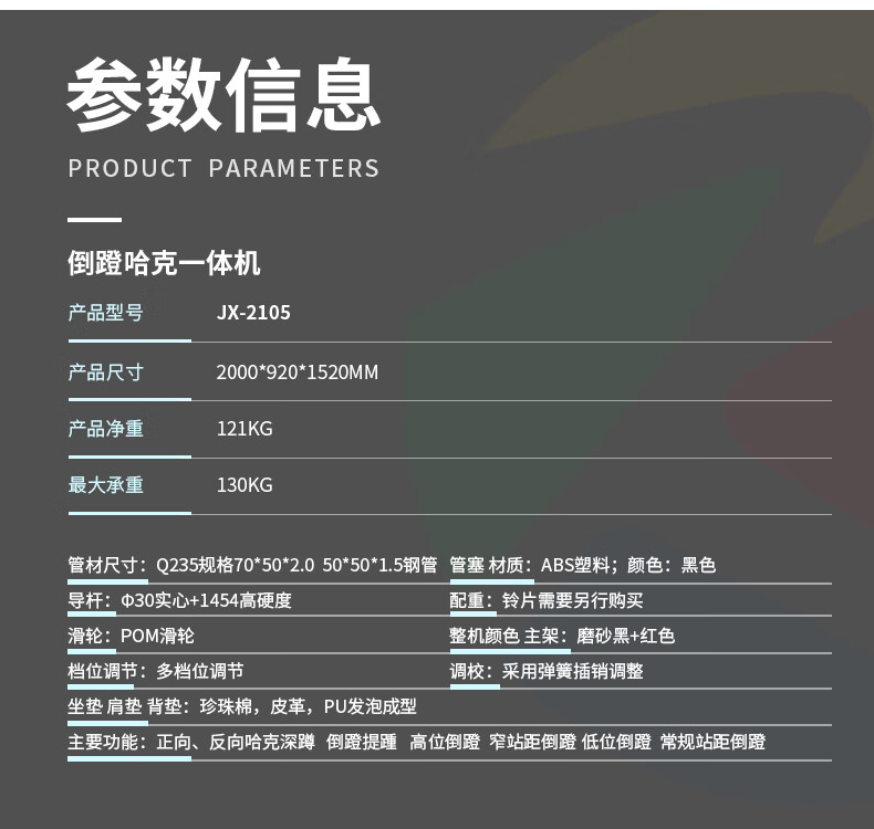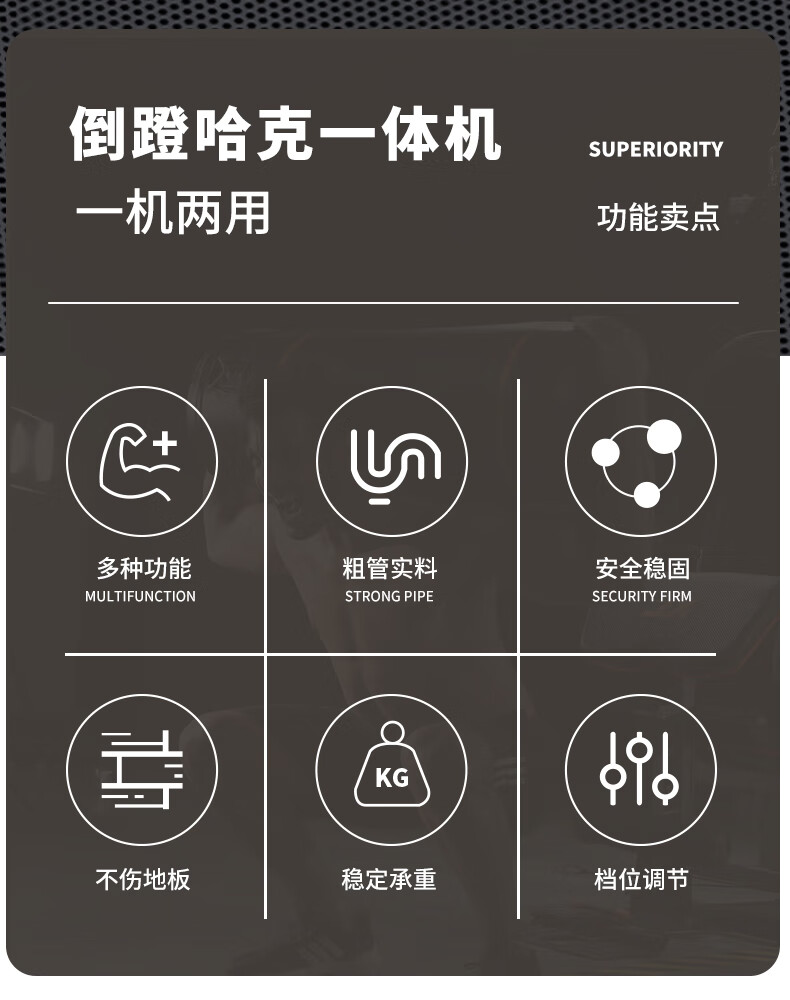 主要训练功能:正向、反向哈克深蹲 倒蹬提踵 高位倒蹬 窄站距倒蹬 低位倒蹬 常规站距倒蹬