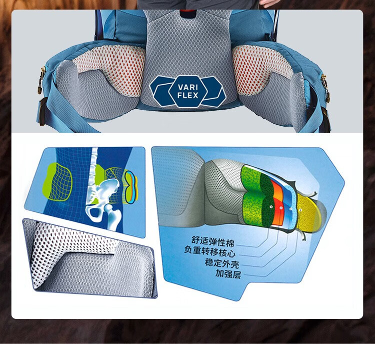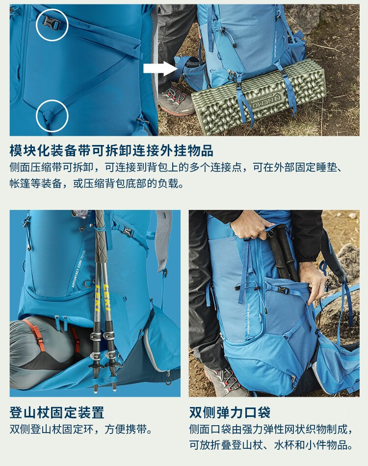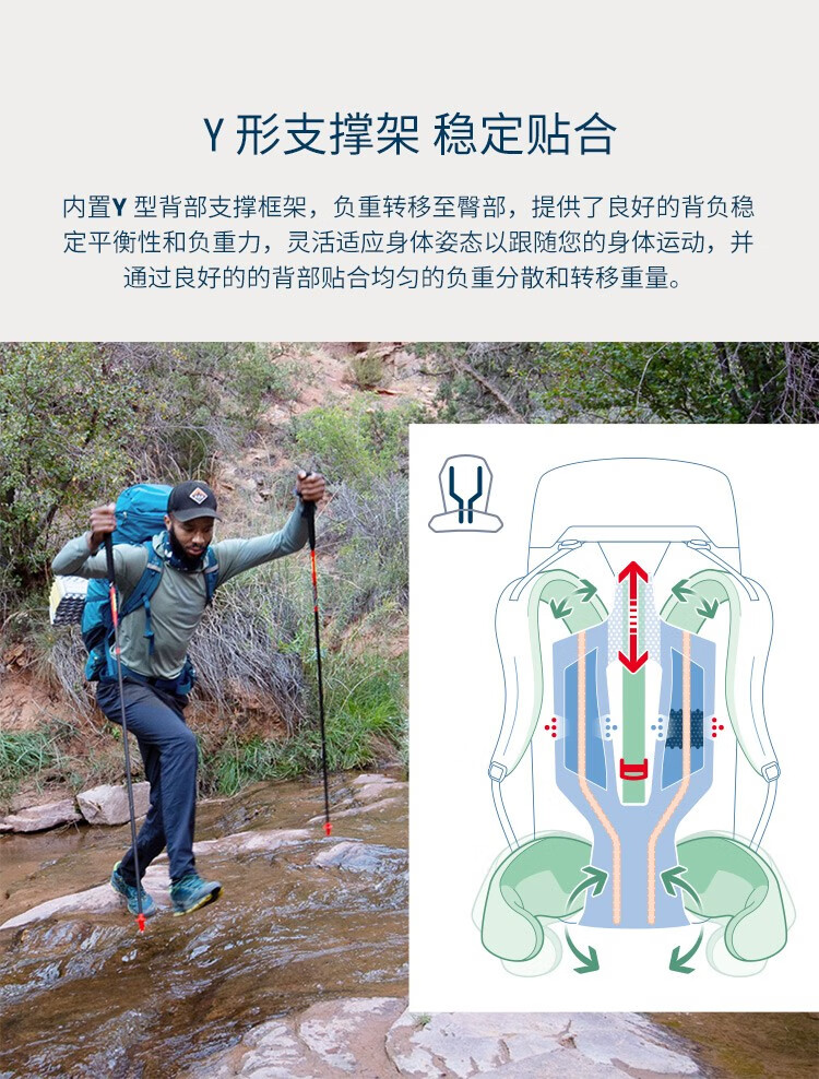 AIRCONTACT CORE 满足背包旅行/徒步露营/乡舍远足出行需求,带有Air Spacer Mesh 和大型通风通道的 Aircontact 空塔背负系统、符合人体工程学的 ActiveFit 肩带和可调节胸带确保了高水平的背负舒适性。Y形框架、可移动的腰翼和符合人体工程学的腰垫确保了良好的负载分布,满足5-7天徒步露营需求。