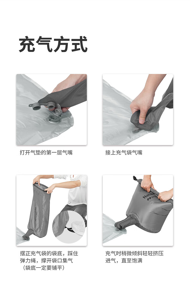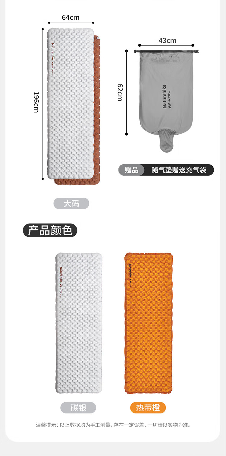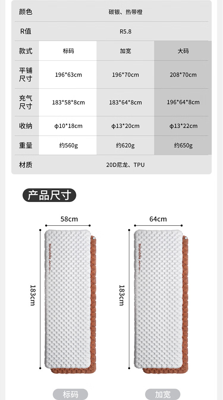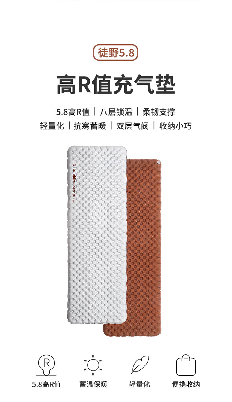 Naturehike 挪客 单人充气垫 徒野5.8高R值超轻充气垫户外露营睡垫 CNH22DZ016 碳银/方形/183*58cm 抗寒蓄暖 双层气阀 收纳小巧