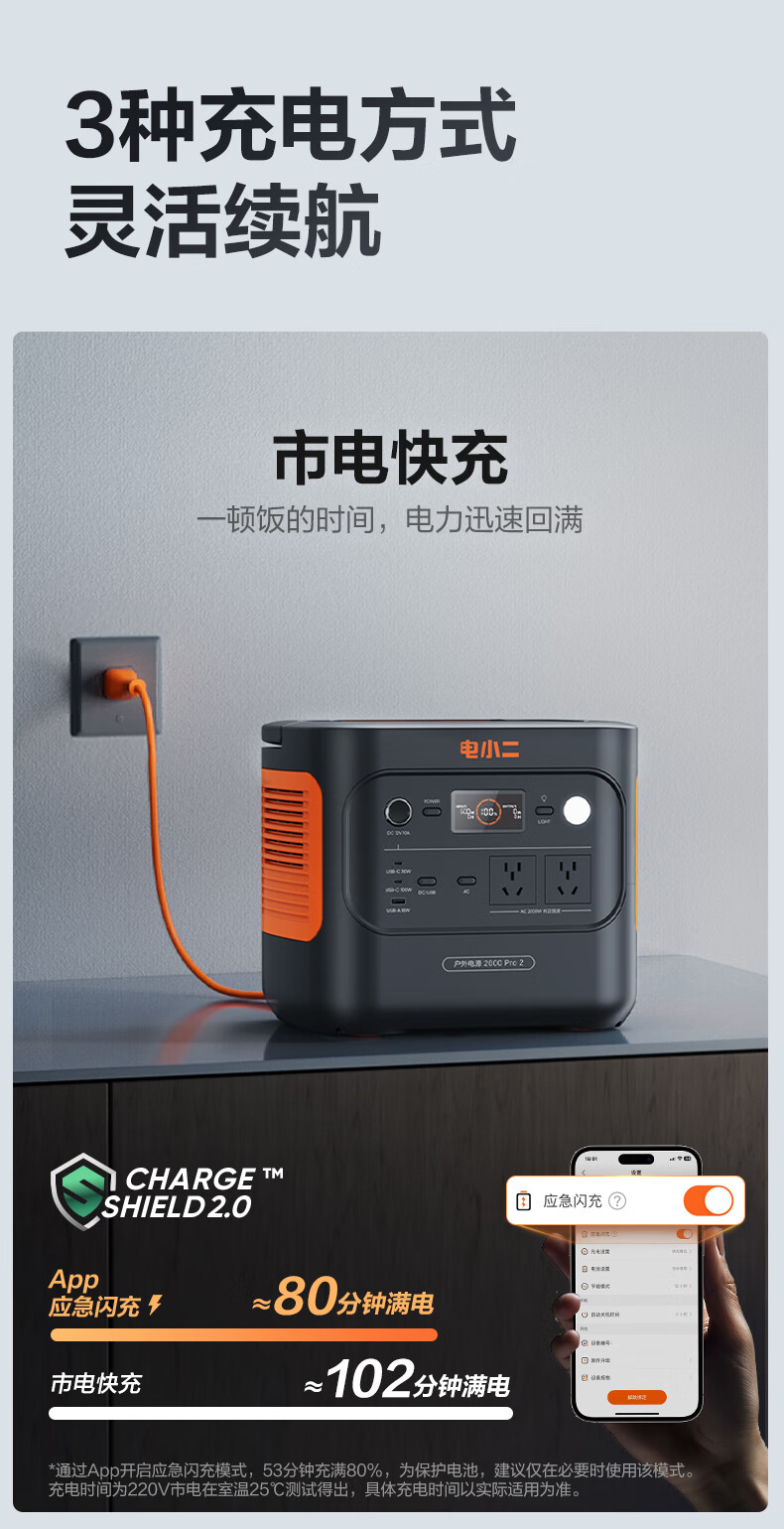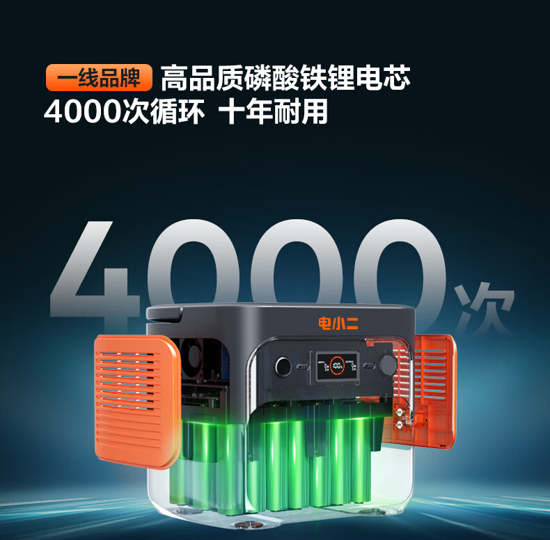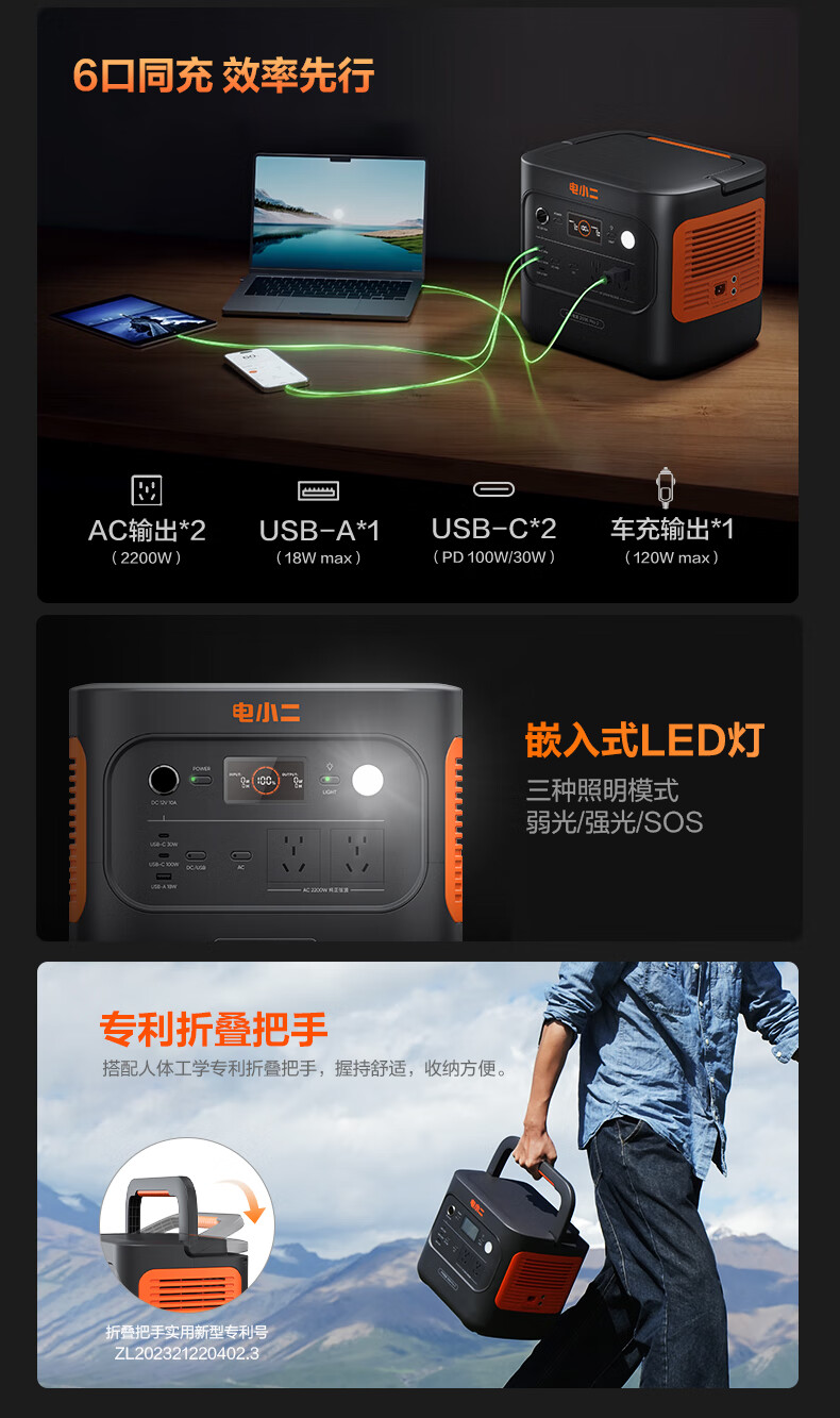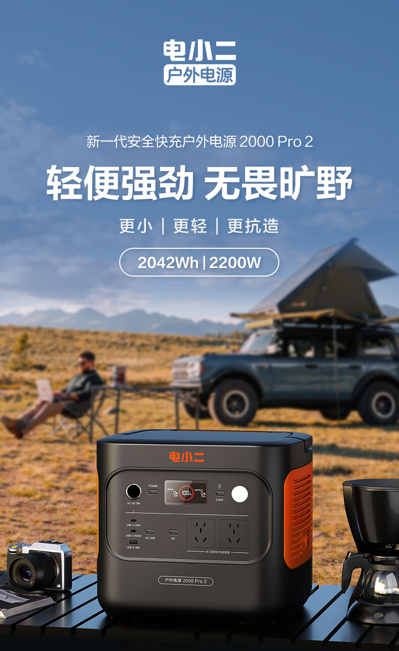电小二 二度电 E2000Pro2 快充户外电源 2200W大功率大容量220V移动电源 车载露营应急户外作业蓄电池 磷酸铁锂电芯 UPS不间断供电