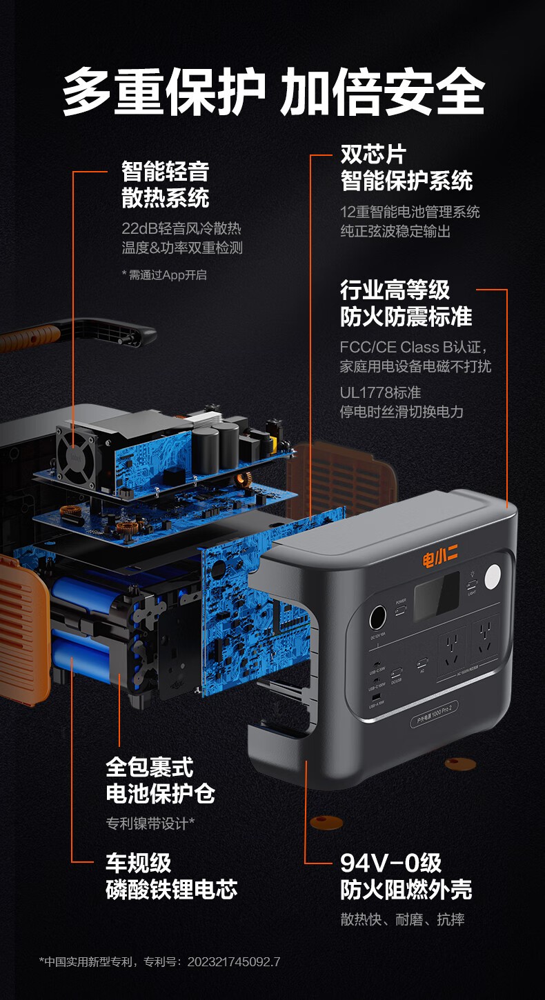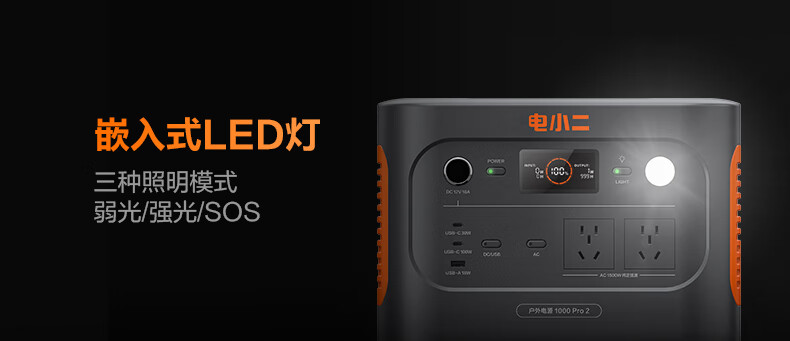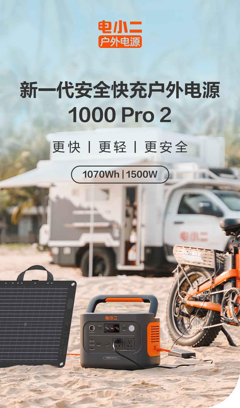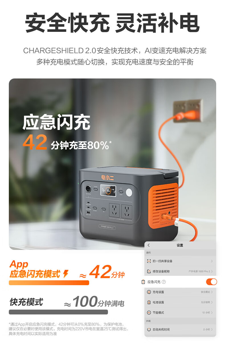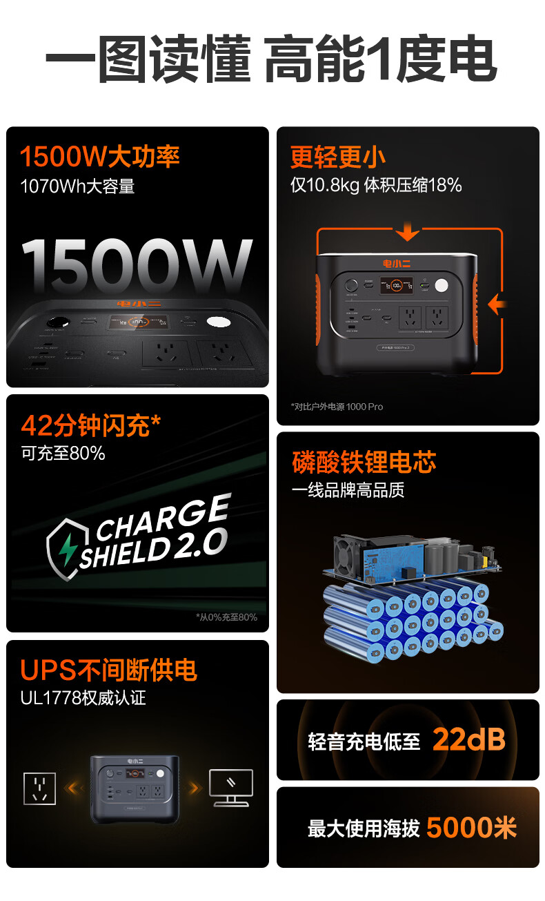 电小二 1度电 E1000Pro2 快充户外电源 1500W大功率大容量220V移动电源 车载充电宝露营应急储能电池 轻量级氮化镓技术 轻音充电 单手可拎