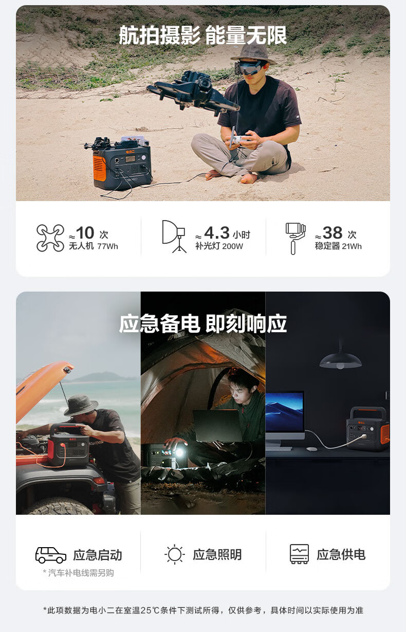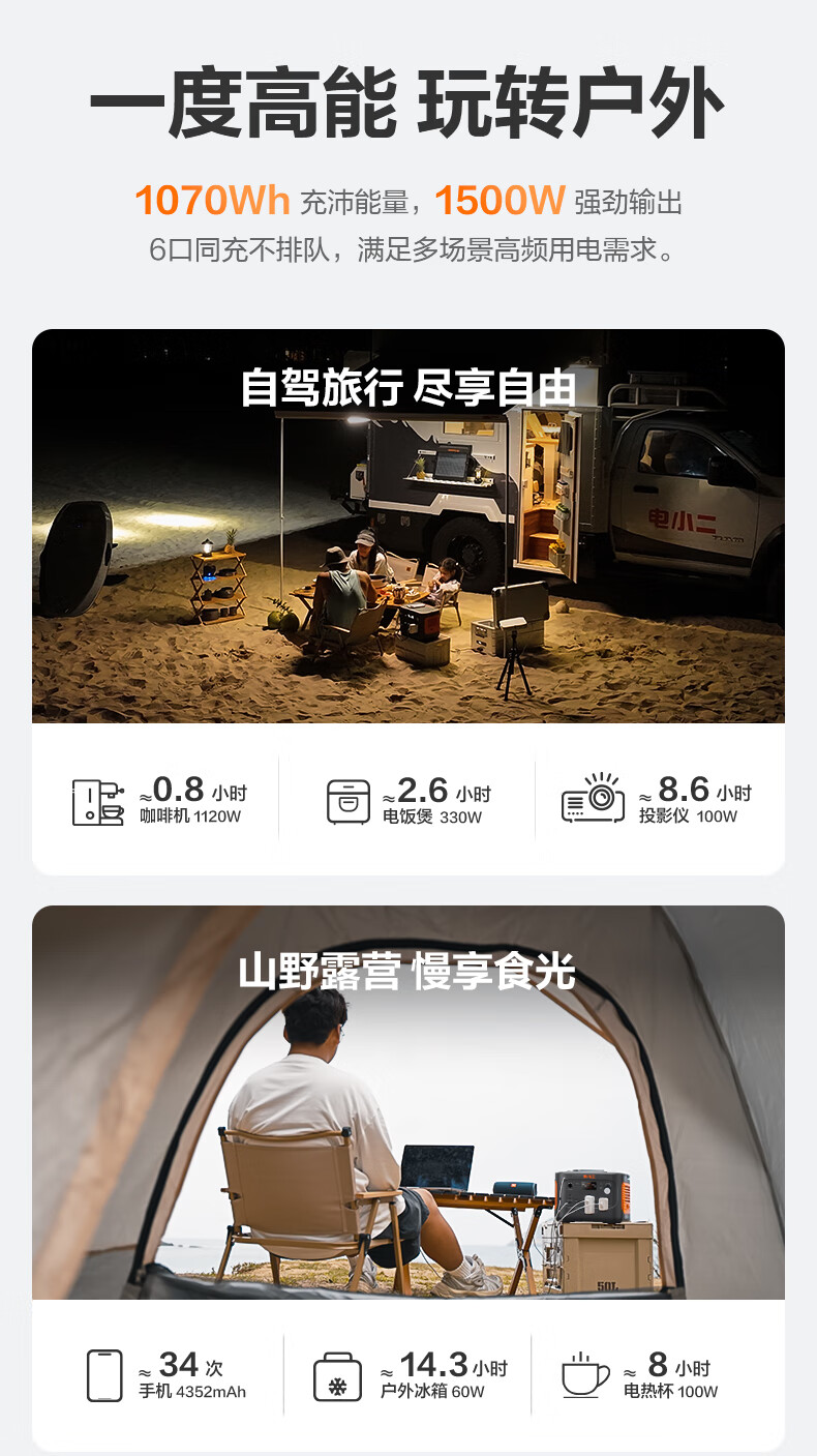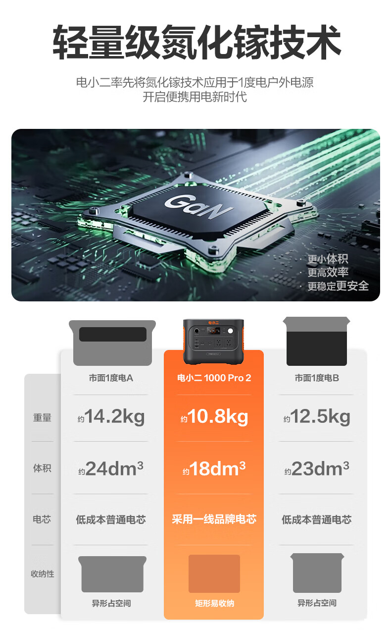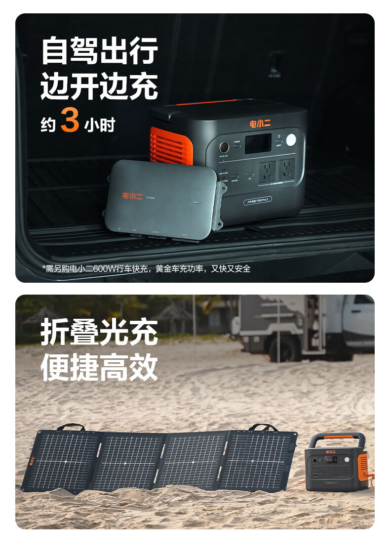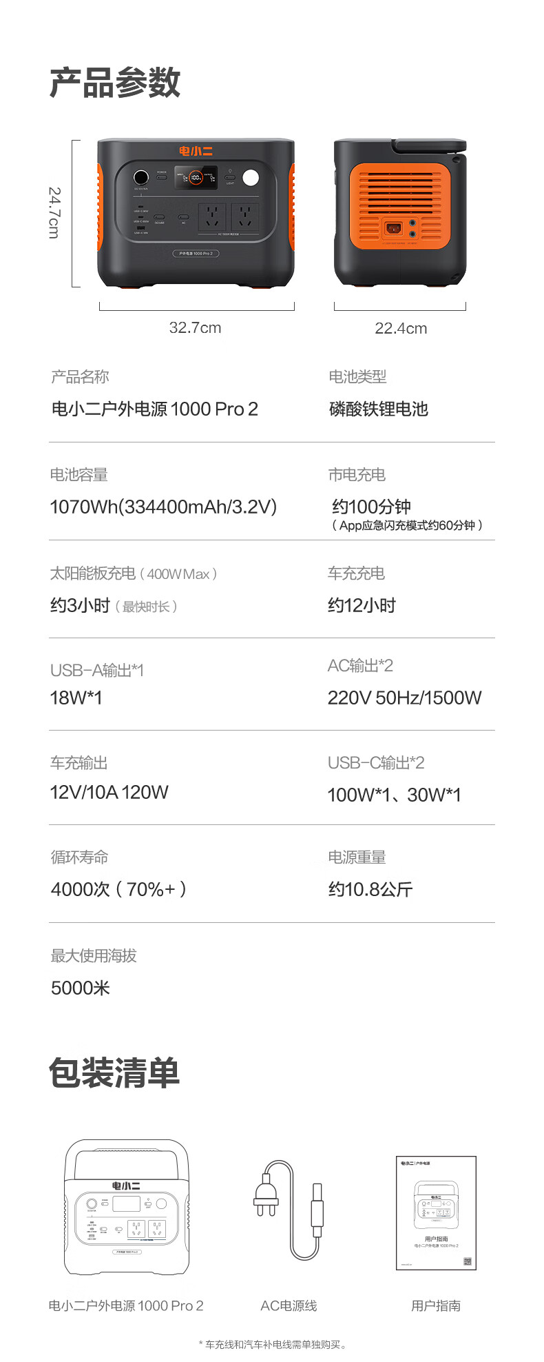 电小二 1度电 E1000Pro2 快充户外电源 1500W大功率大容量220V移动电源 车载充电宝露营应急储能电池 轻量级氮化镓技术 轻音充电 单手可拎