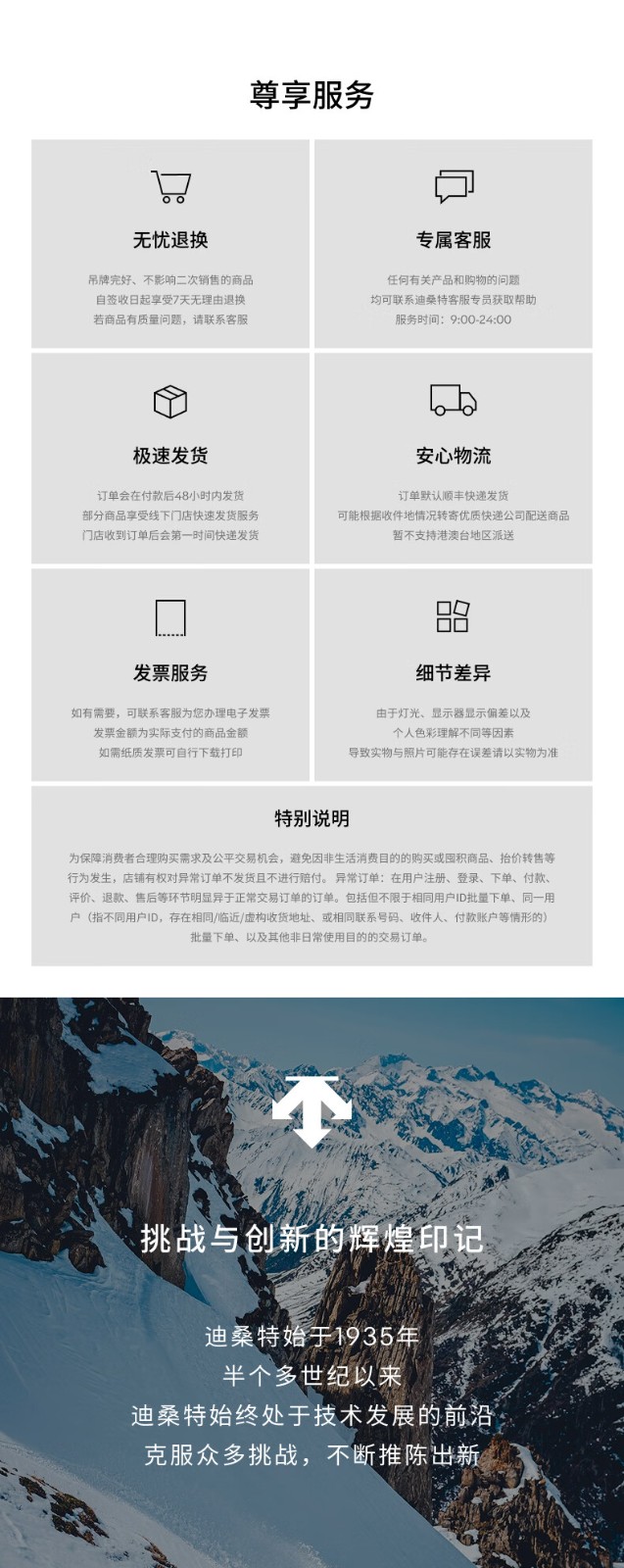 2)七天退换保障:自您签收商品后7天内,因尺码不合适,货品外观大小,颜色,形状的感受偏差,订购错误等,在商品未使用、未拆毁包装、未剪掉或丢失吊卡说明书等不影响二次销售的情况下,可以为您退换商品(下文中说明的不能退换的商品除外)。