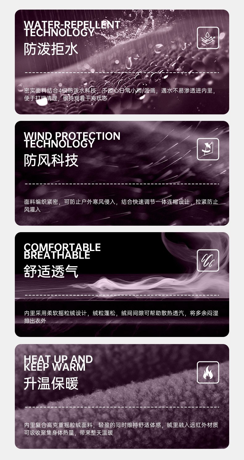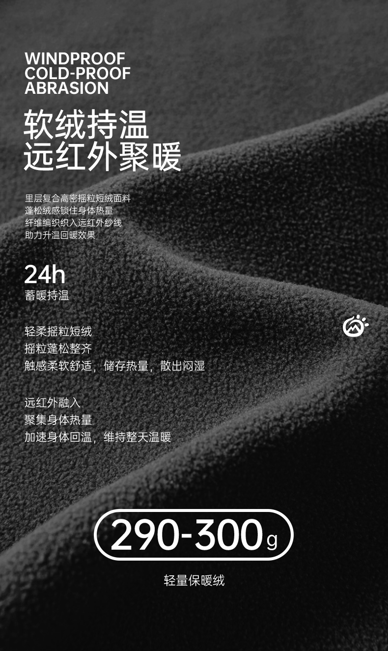 外层面料为四面弹软壳材质紧密防风,耐刮磨,添加4级防泼水工艺,日常小雨/泼溅不易湿,方便清洁打理:内里复合290-300克柔软摇粒绒,软糯亲肤,融入远红外材质,聚集身体热量,提供舒适暖意。快调连帽,防风保暖加倍。