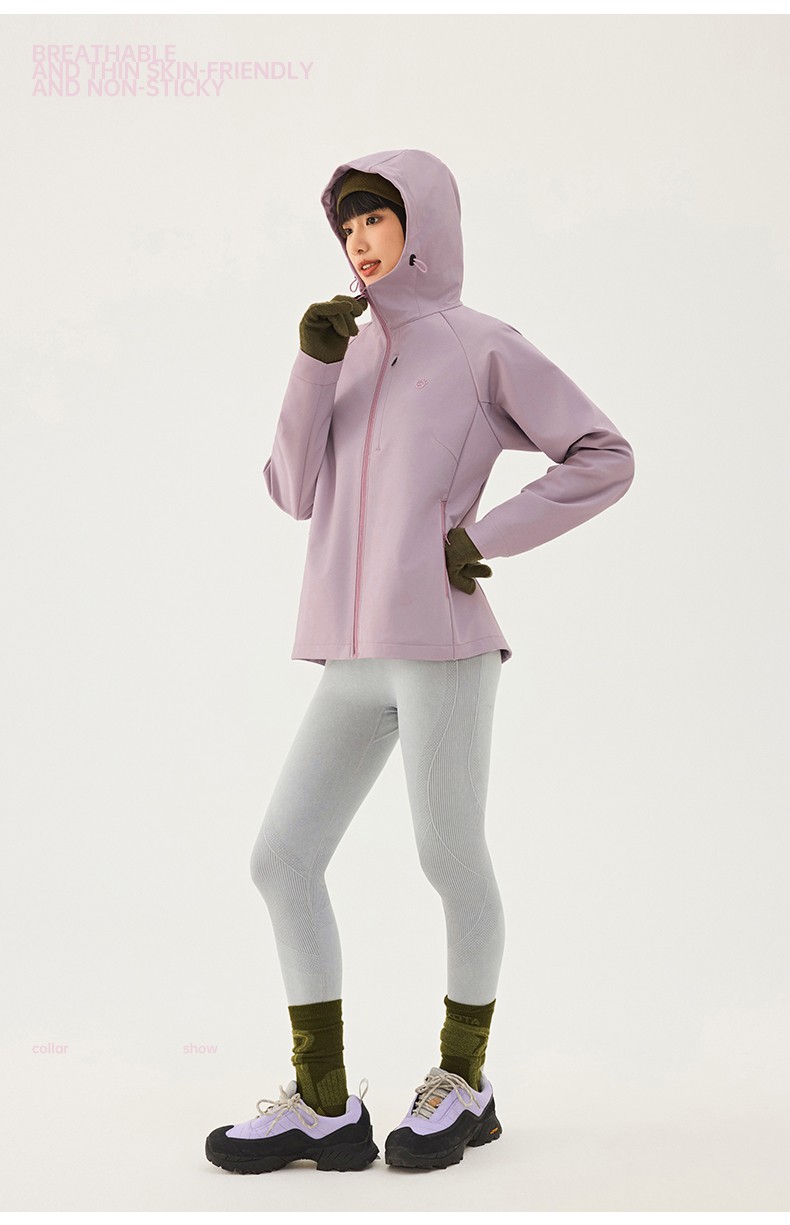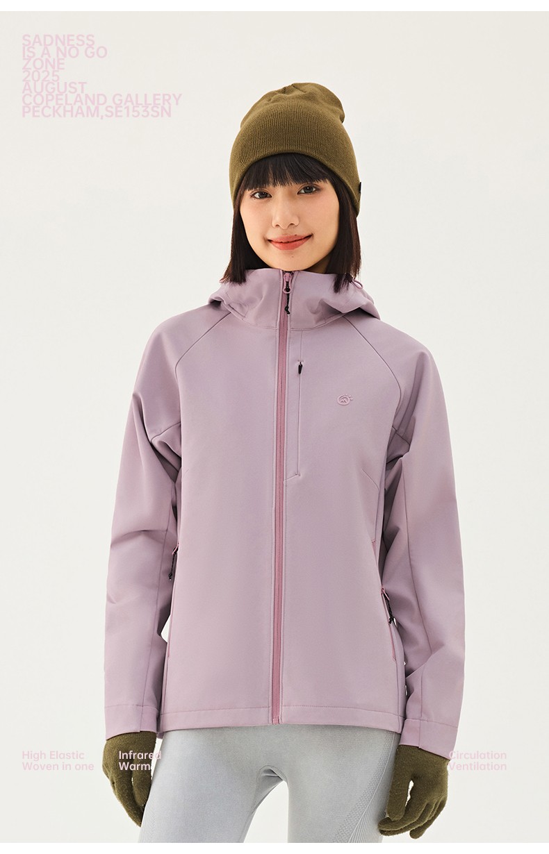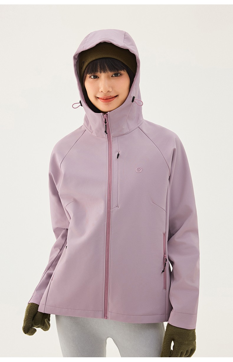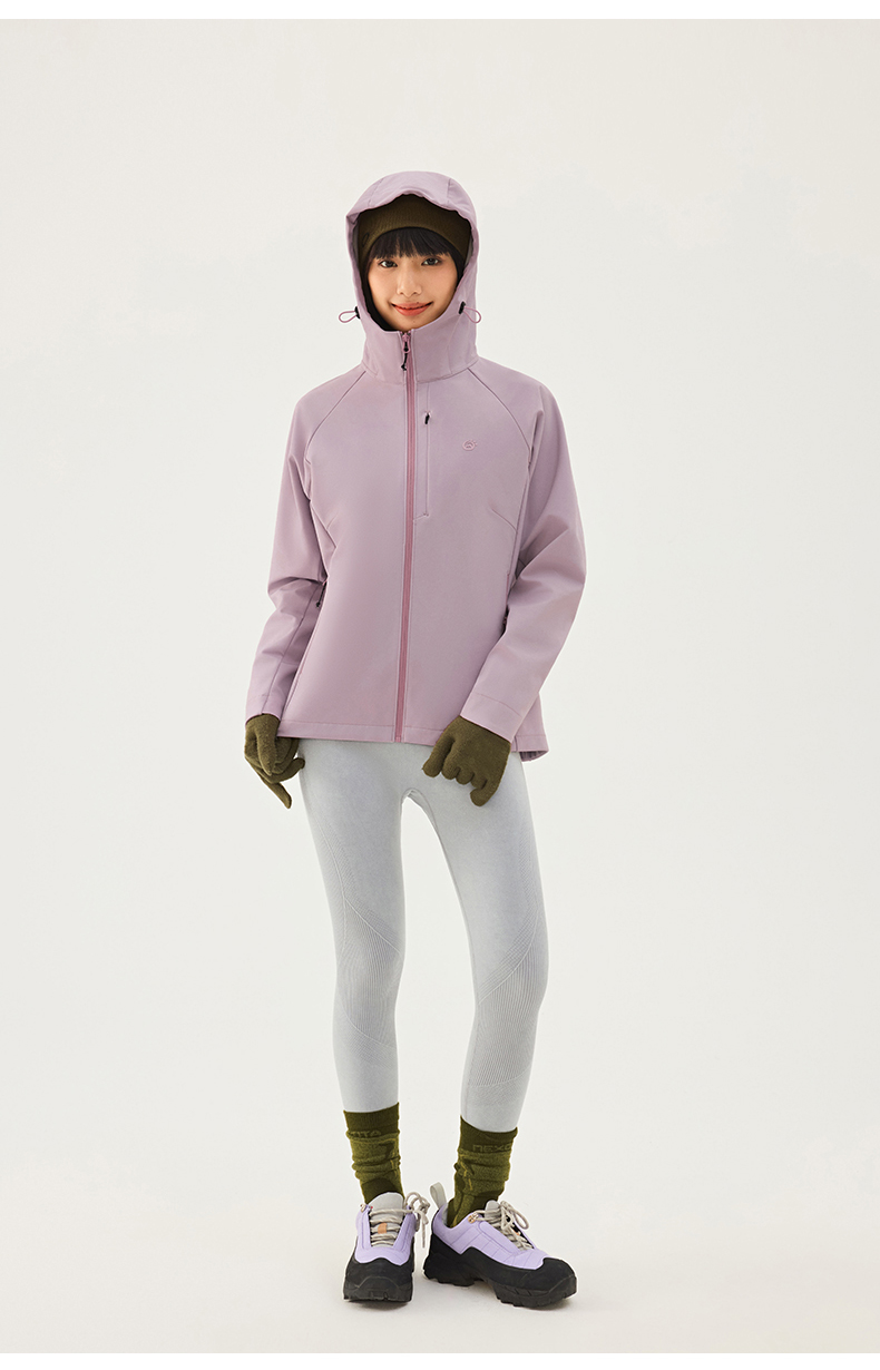 为防护秋冬寒风而准备的女式连帽软壳外套,具有防风、防泼水、弹力、透气、升温、保暖等多项功能,轻松行走城市户外多场景。