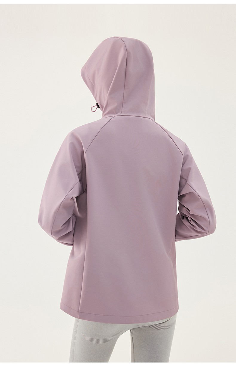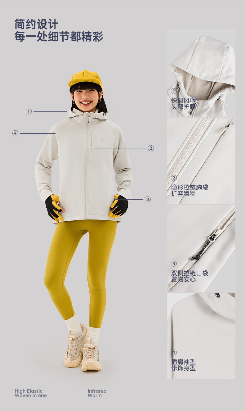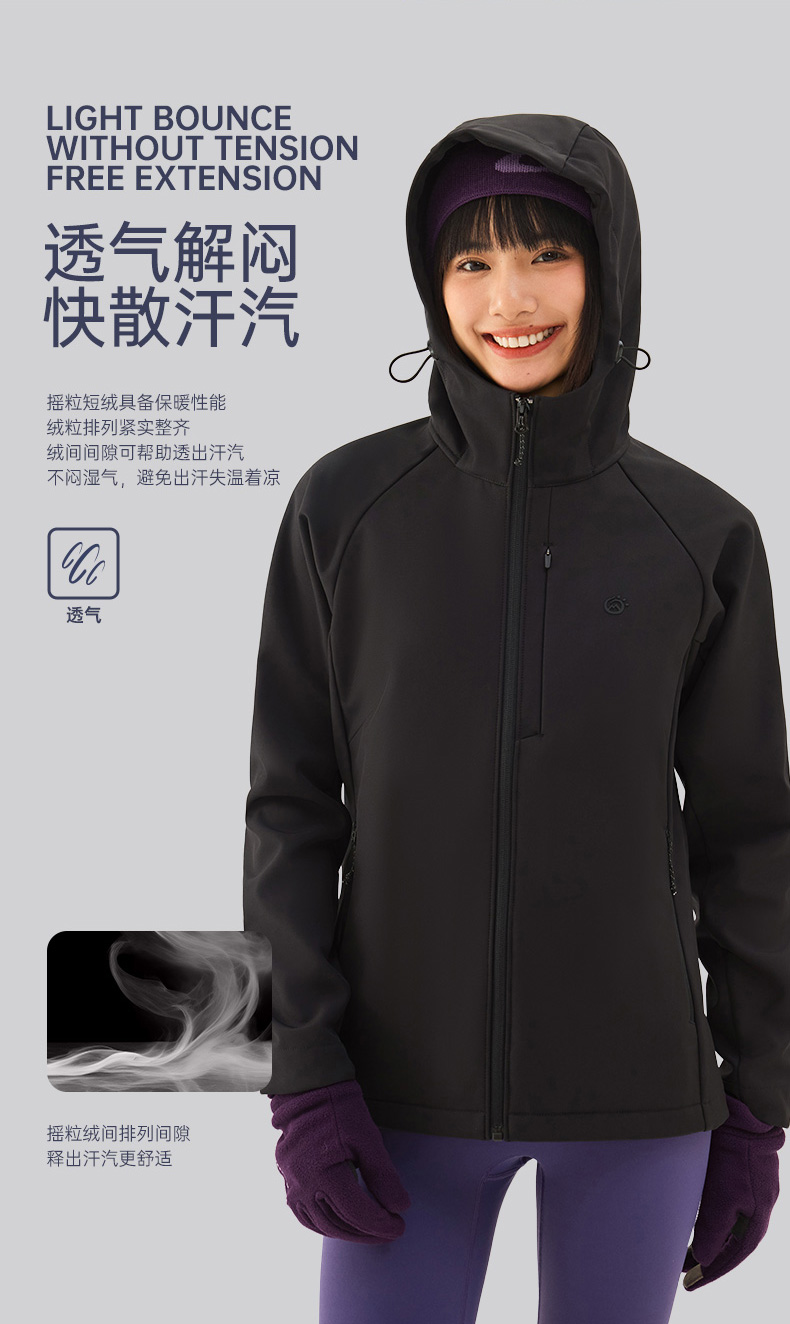 为防护秋冬寒风而准备的女式连帽软壳外套,具有防风、防泼水、弹力、透气、升温、保暖等多项功能,轻松行走城市户外多场景。