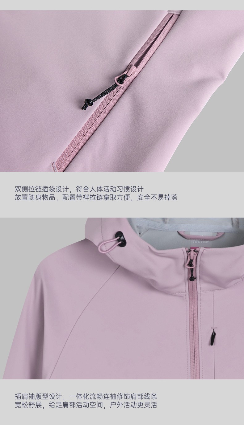 探拓 户外女士软壳衣 秋冬加绒防风防泼水徒步登山连帽外套 2537058WT 樱落粉 保暖透气 防风防泼水 轻防风雨 热能暖绒