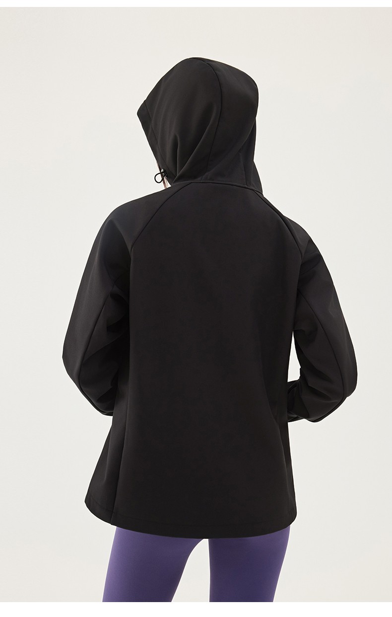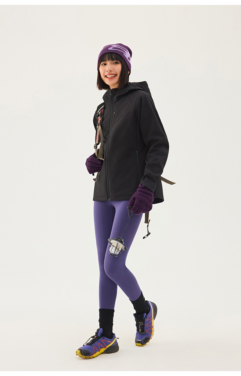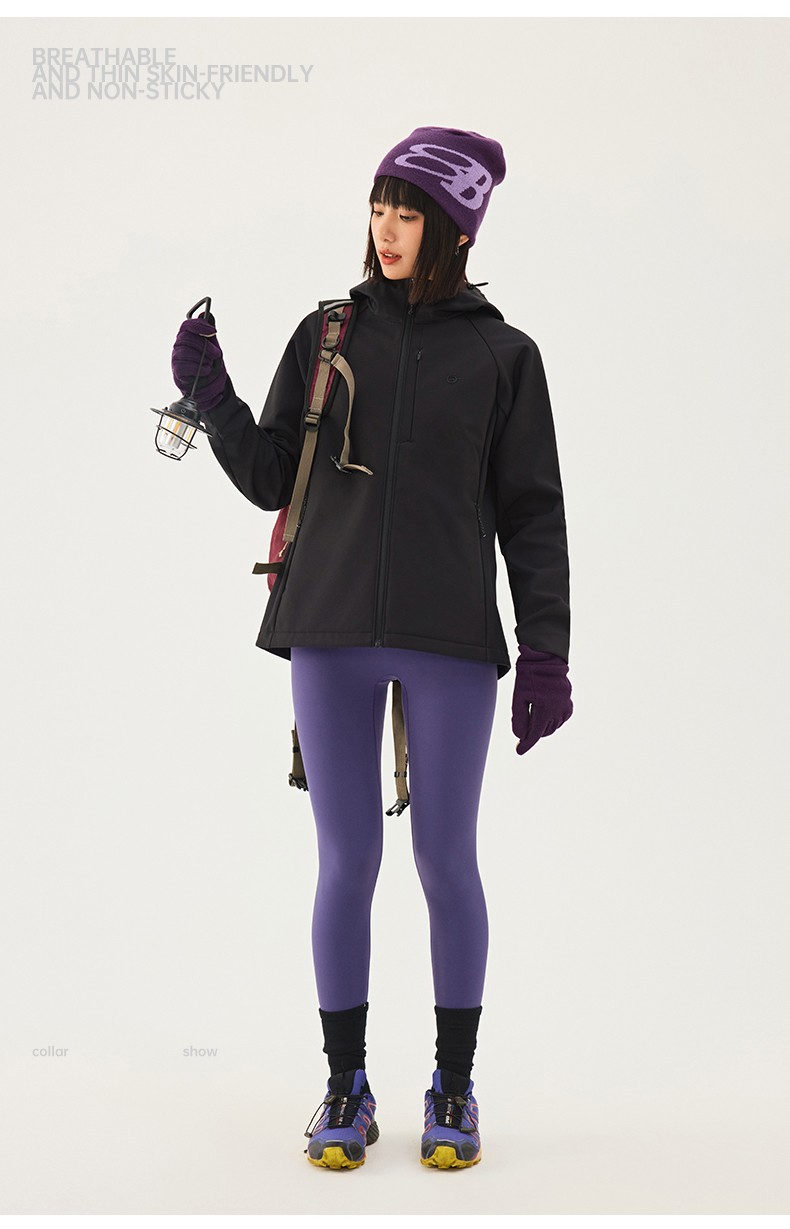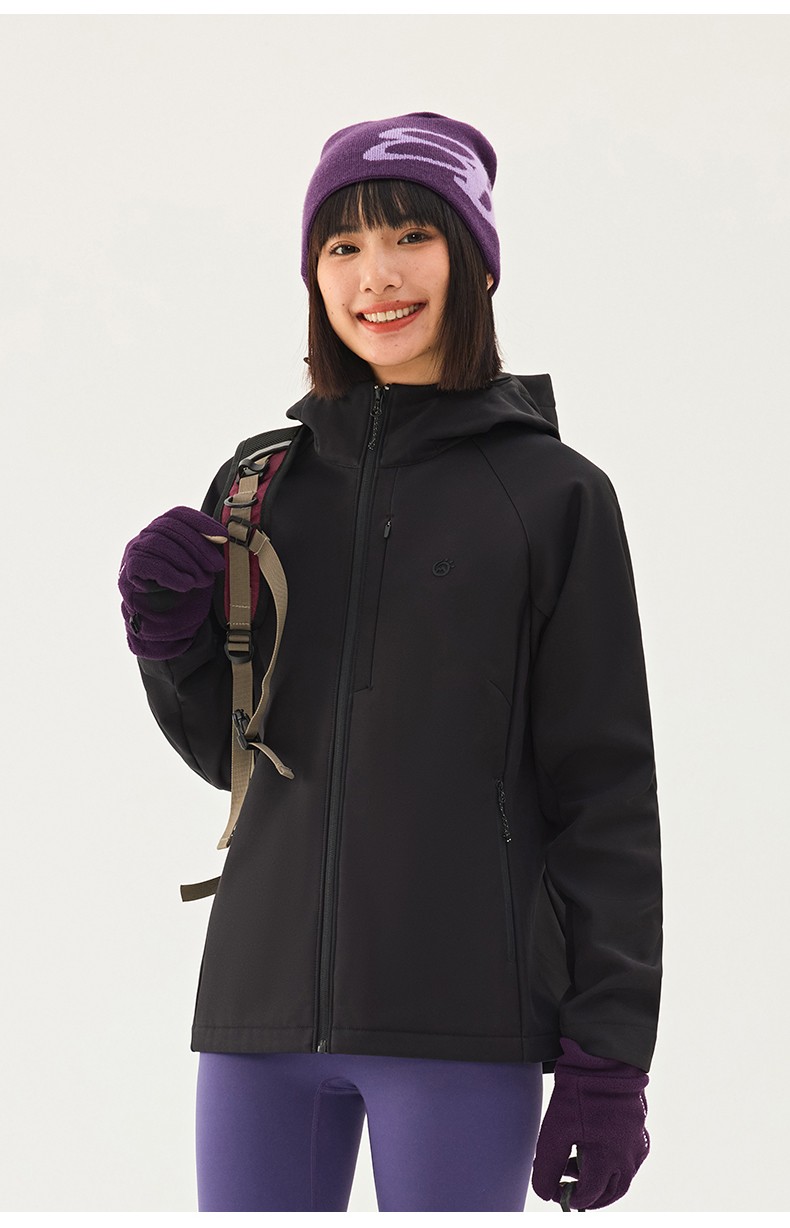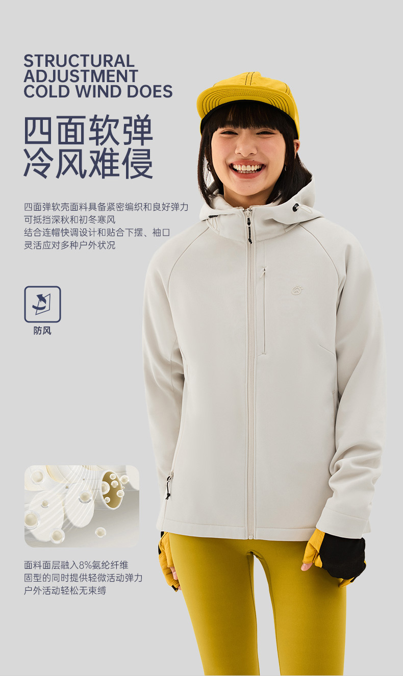 为防护秋冬寒风而准备的女式连帽软壳外套,具有防风、防泼水、弹力、透气、升温、保暖等多项功能,轻松行走城市户外多场景。