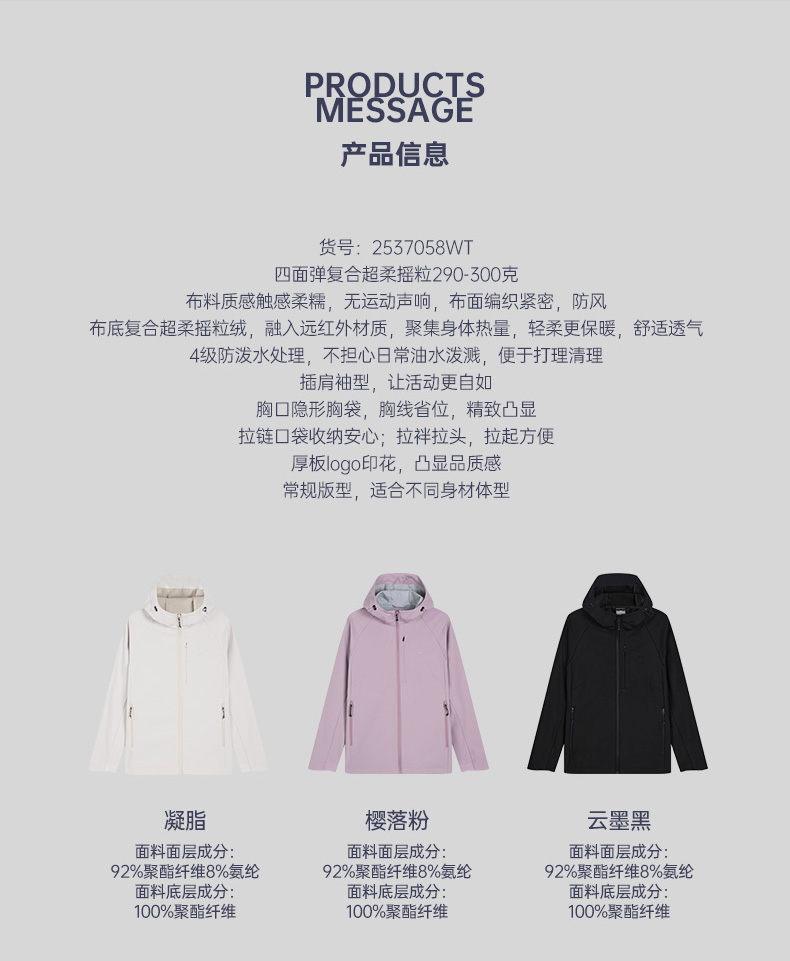 外层面料为四面弹软壳材质紧密防风,耐刮磨,添加4级防泼水工艺,日常小雨/泼溅不易湿,方便清洁打理:内里复合290-300克柔软摇粒绒,软糯亲肤,融入远红外材质,聚集身体热量,提供舒适暖意。快调连帽,防风保暖加倍。