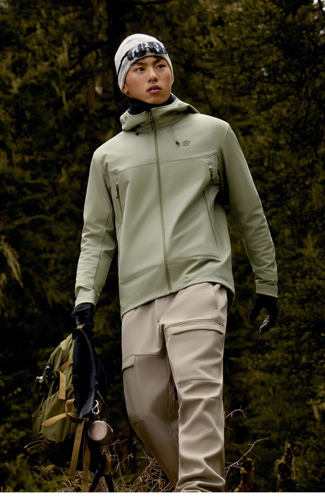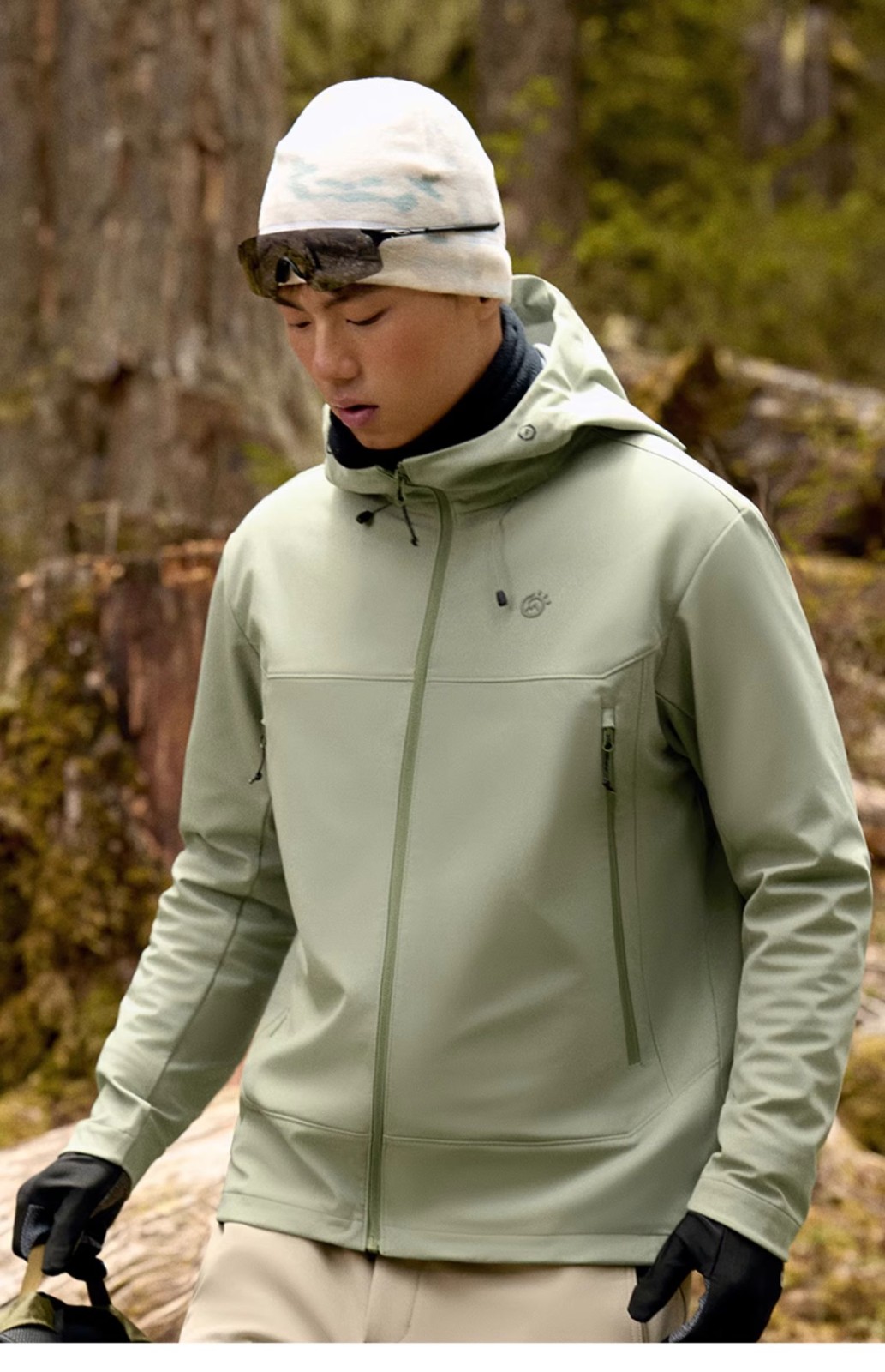 探拓 户外软壳衣男款 加绒防风防泼水透气徒步登山连帽外套 2537085WT 青雾绿 紧密防风 不留空隙 柔弹担寒 绒里升温