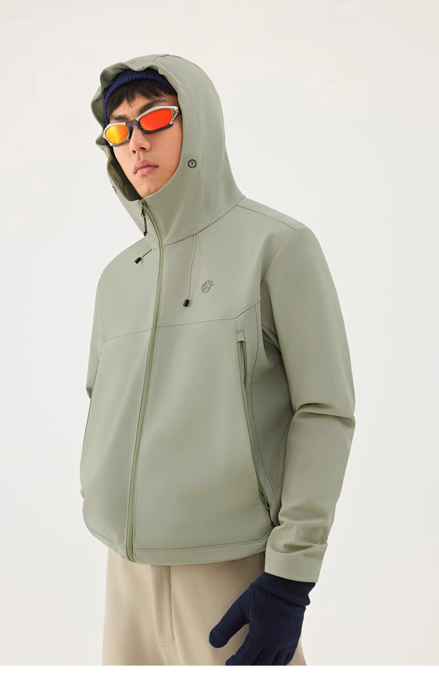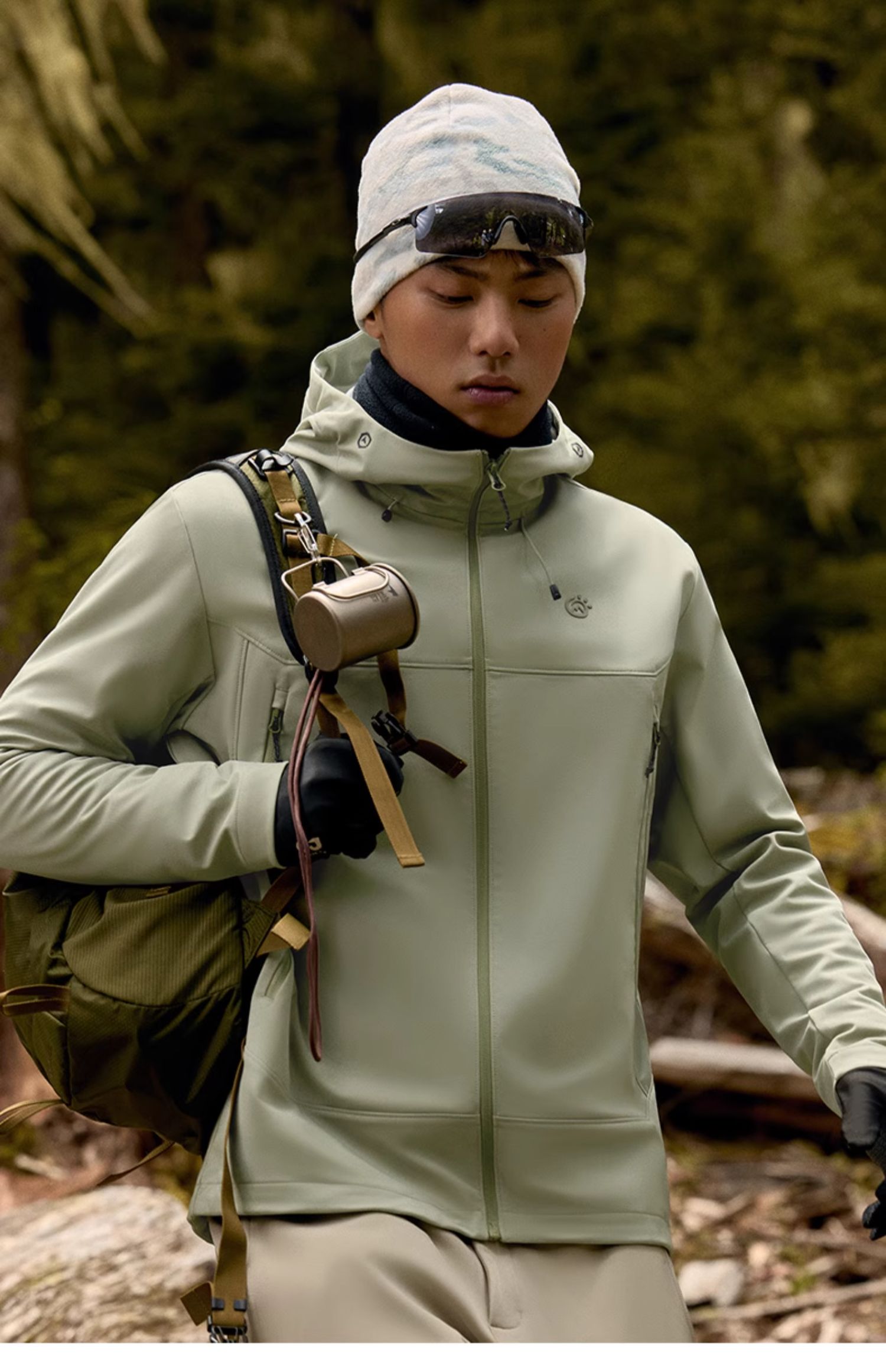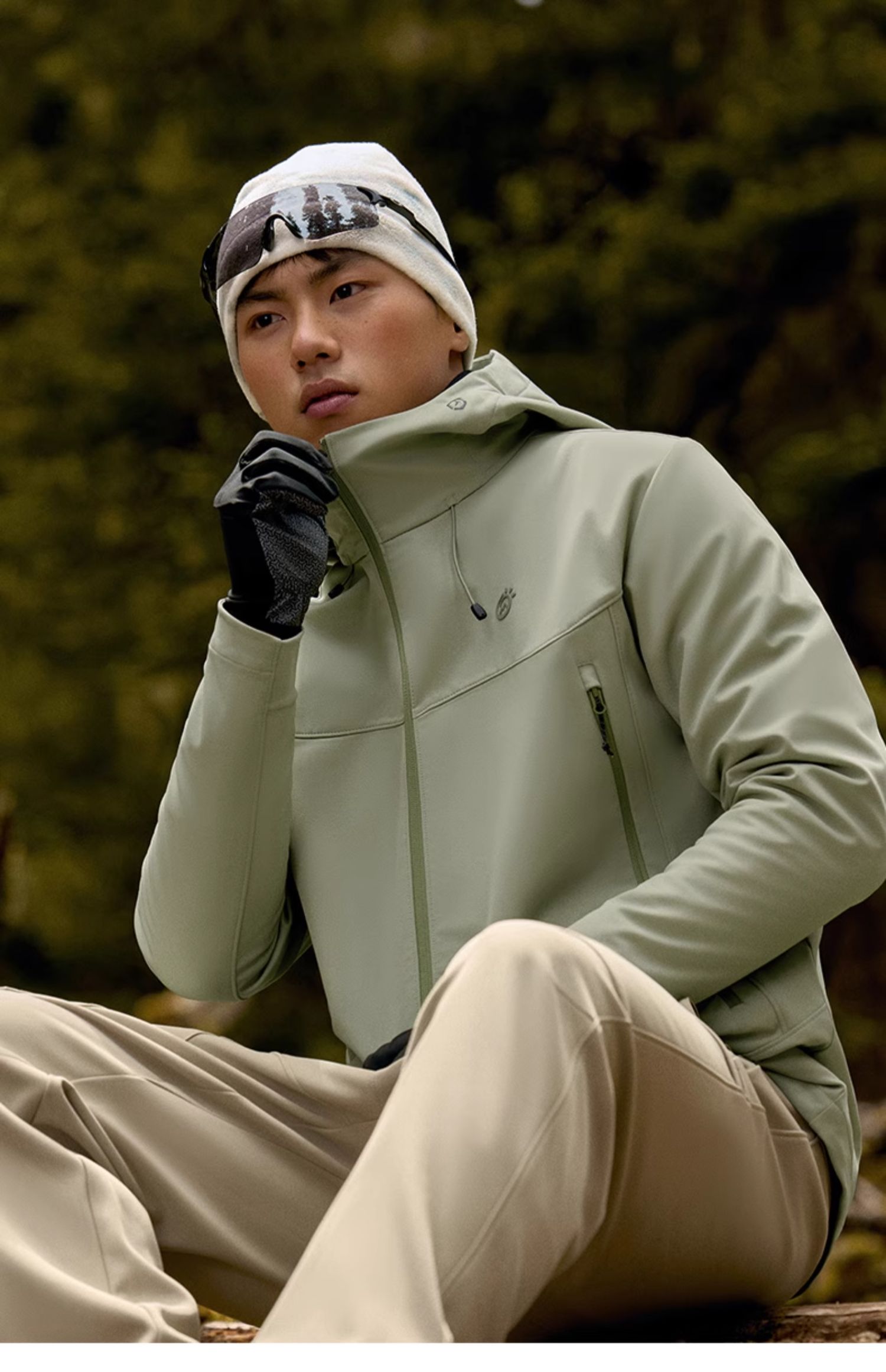 外层面料为四面弹软壳材质紧密防风,耐刮磨,添加4级防泼水工艺,日常小雨/泼溅不易湿,方便清洁打理:内里复合290-300克柔软摇粒绒,软糯亲肤,提供舒适暖意。快调连帽,弹力可调下摆,防风保暖加倍。