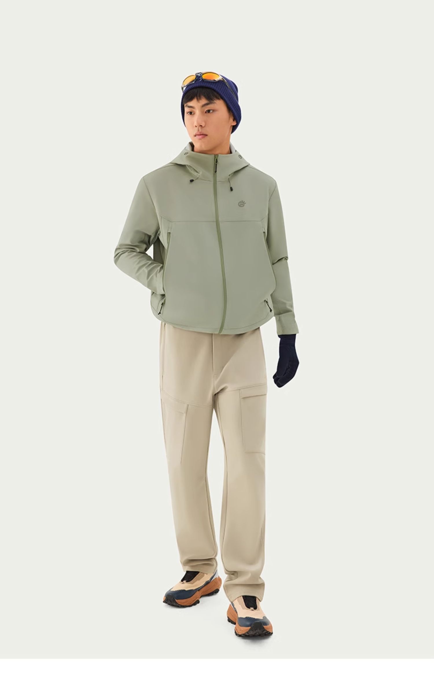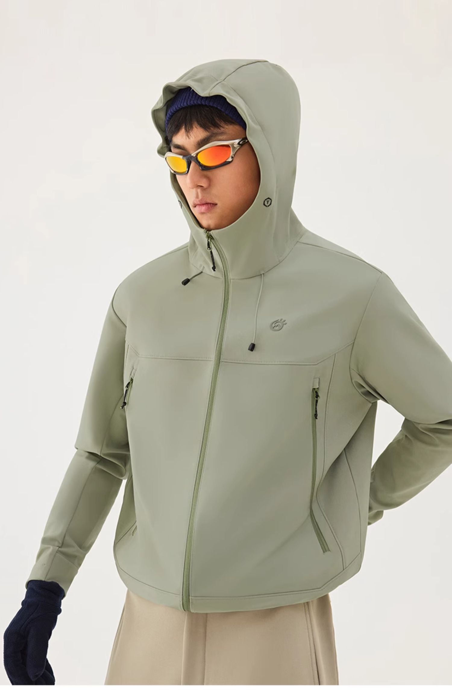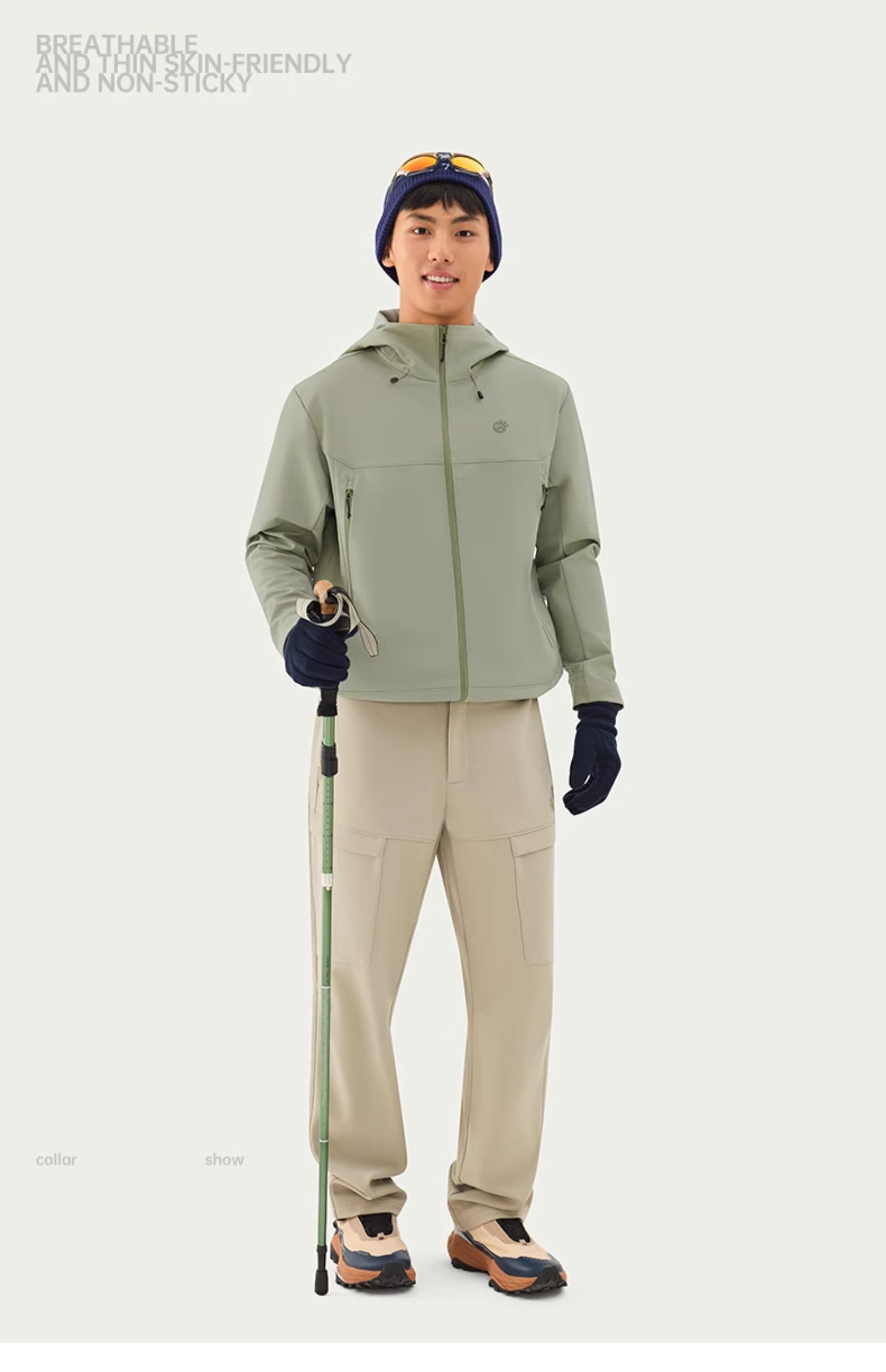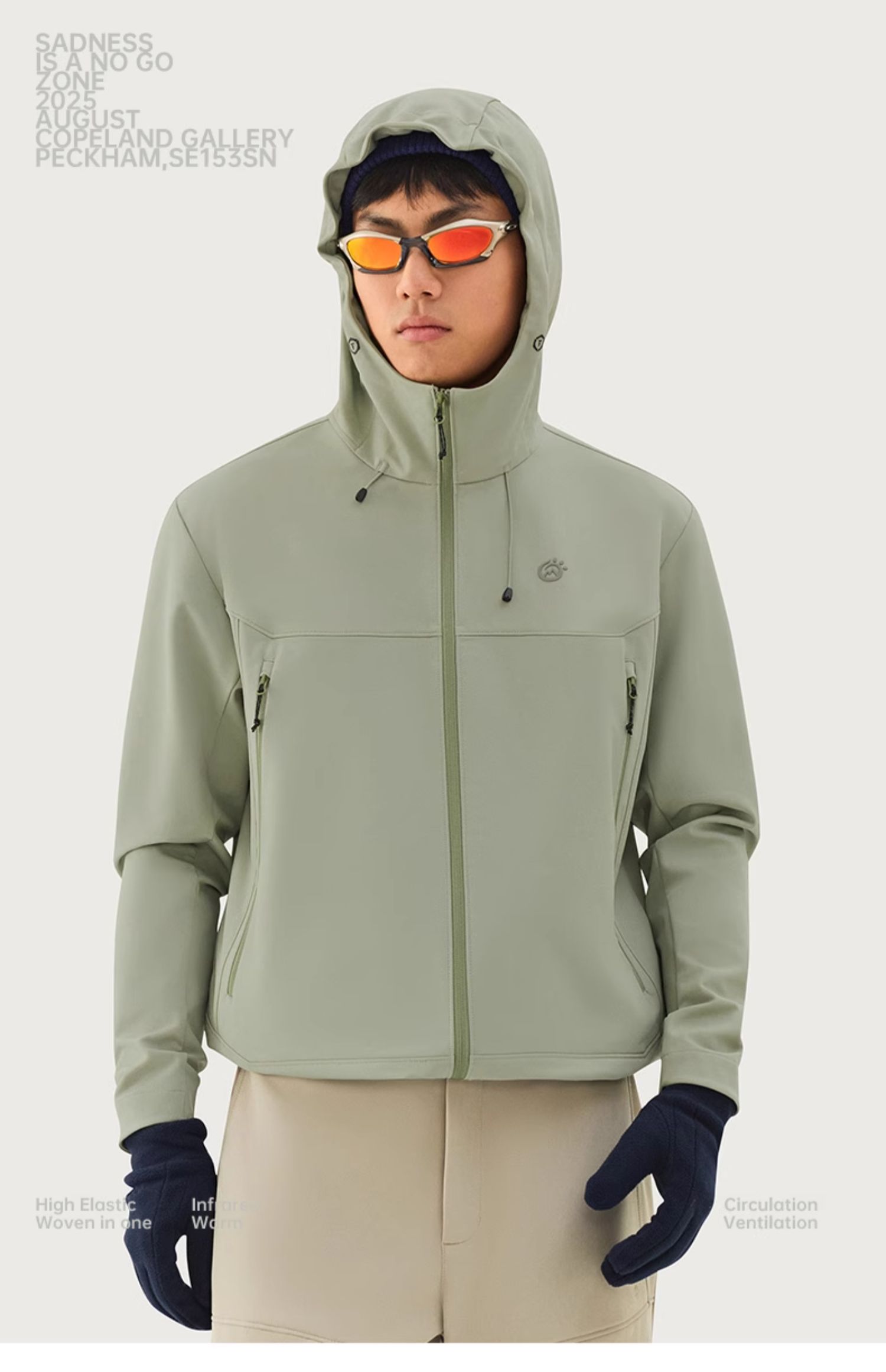 外层面料为四面弹软壳材质紧密防风,耐刮磨,添加4级防泼水工艺,日常小雨/泼溅不易湿,方便清洁打理:内里复合290-300克柔软摇粒绒,软糯亲肤,提供舒适暖意。快调连帽,弹力可调下摆,防风保暖加倍。