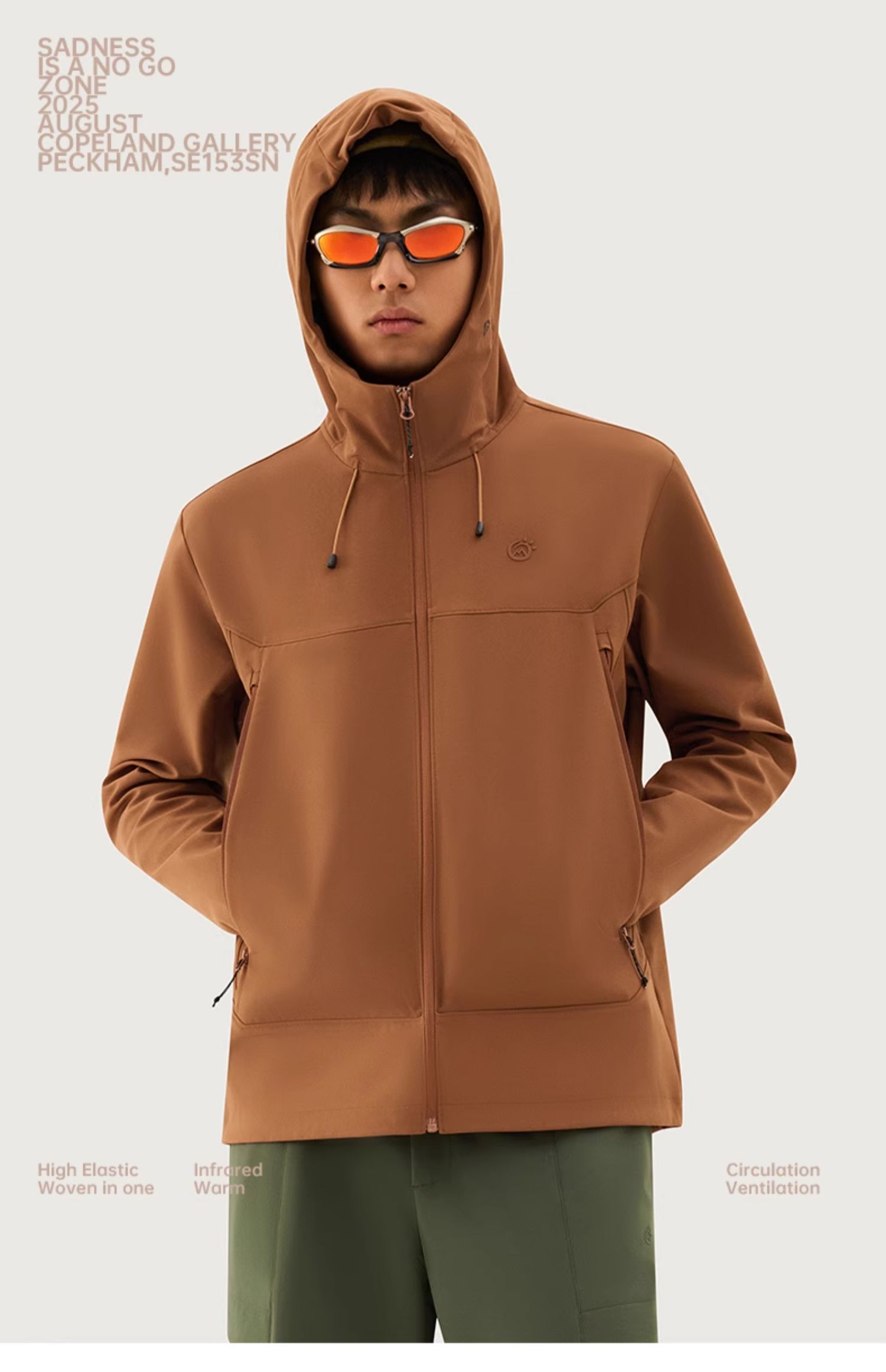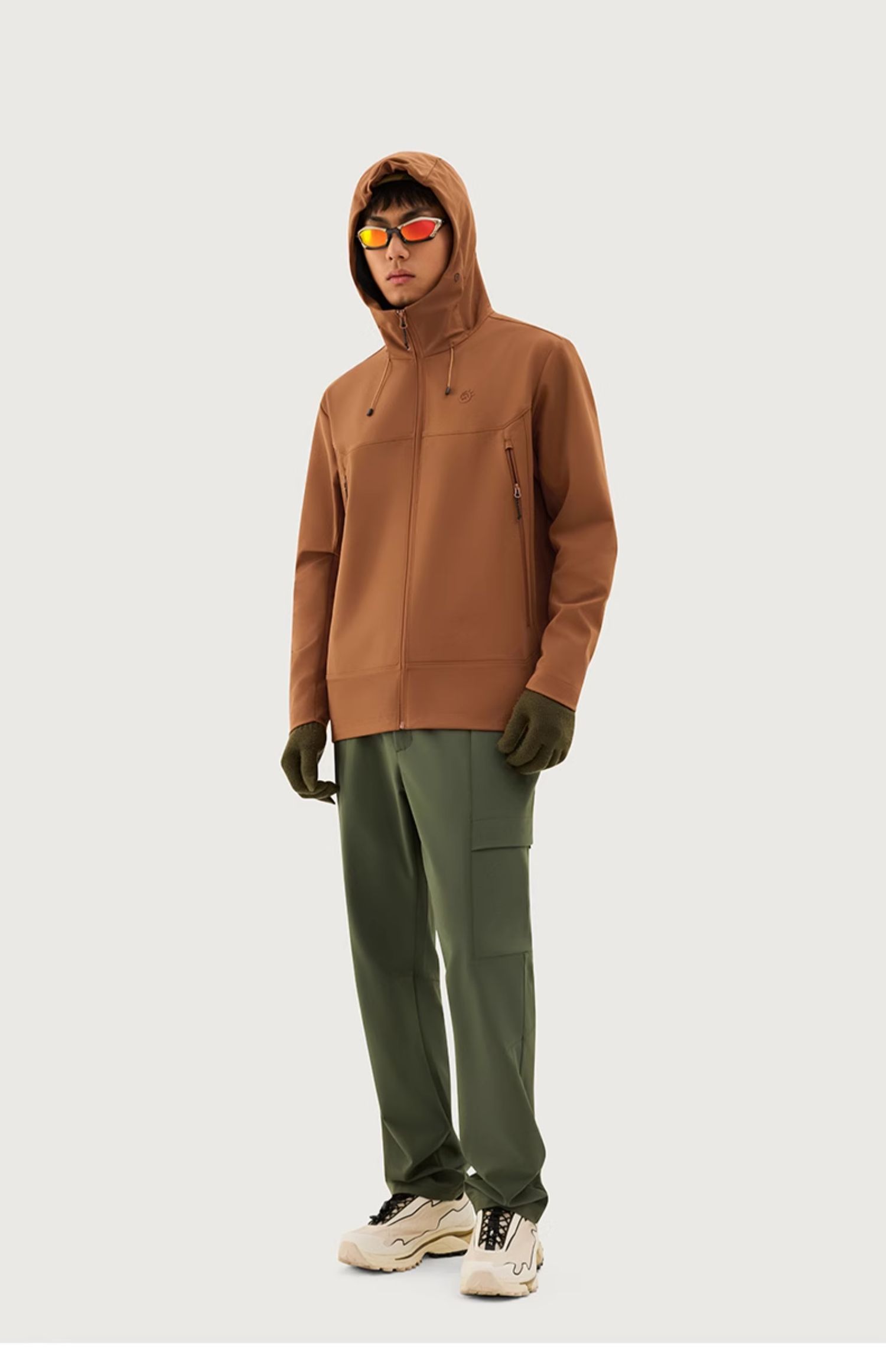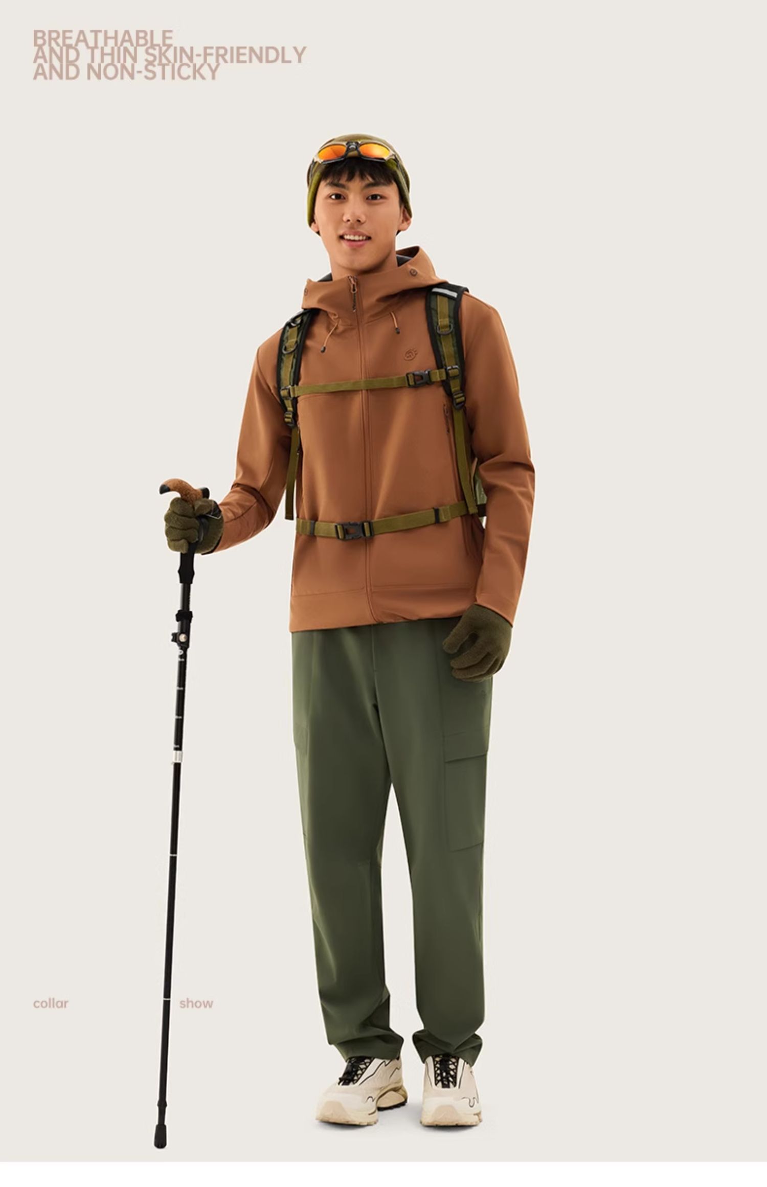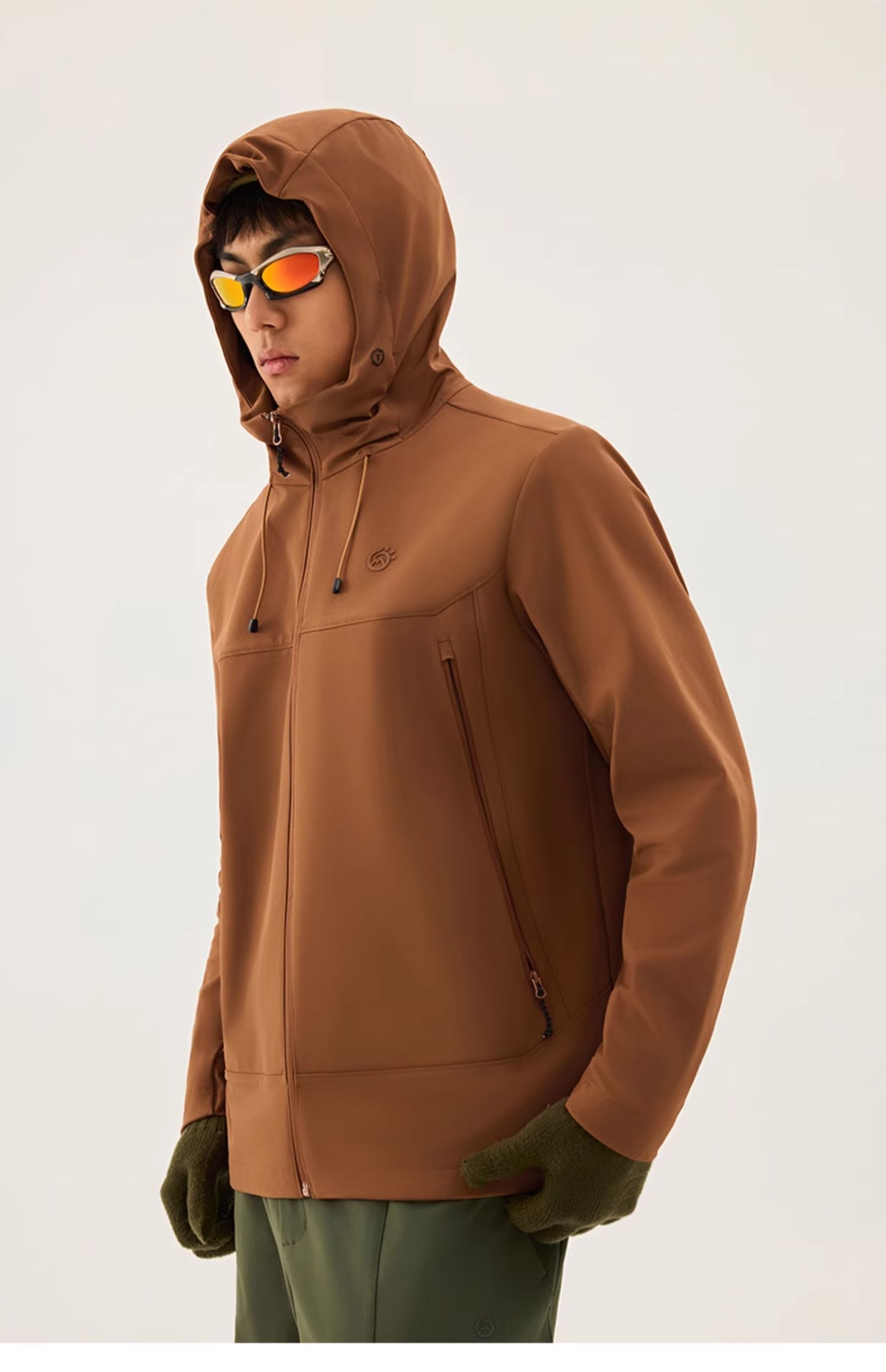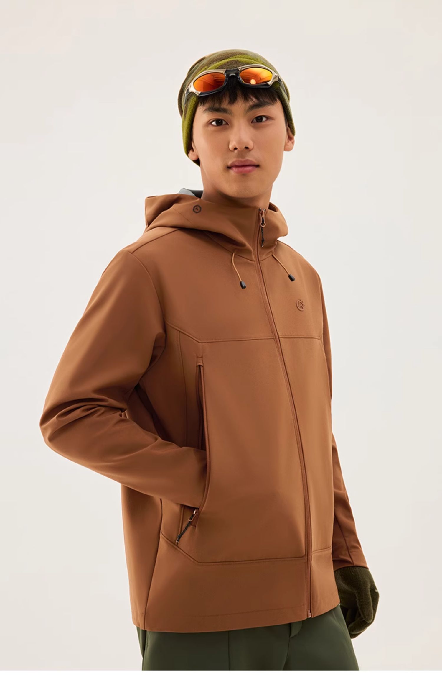 外层面料为四面弹软壳材质紧密防风,耐刮磨,添加4级防泼水工艺,日常小雨/泼溅不易湿,方便清洁打理:内里复合290-300克柔软摇粒绒,软糯亲肤,提供舒适暖意。快调连帽,弹力可调下摆,防风保暖加倍。