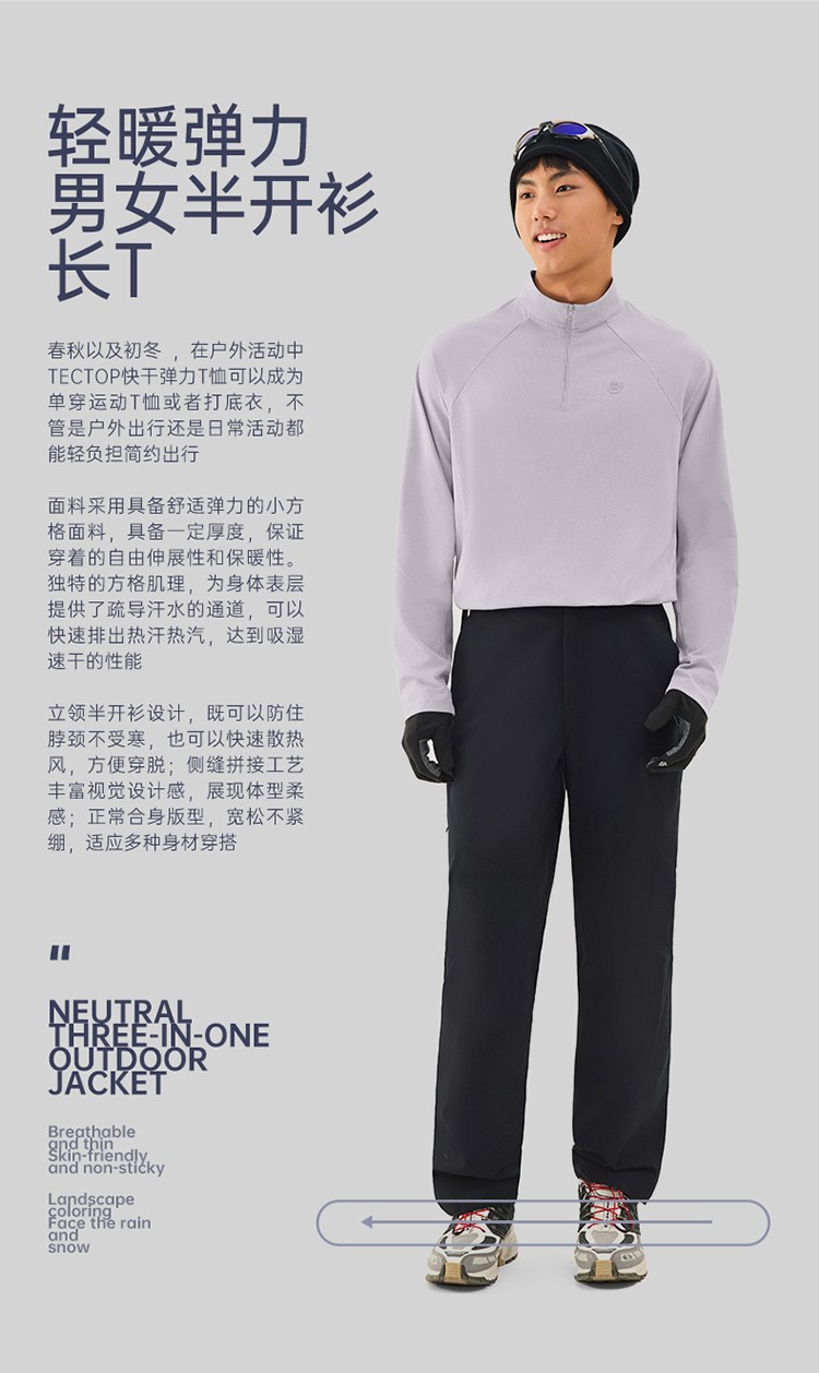 春秋以及初冬 ,在户外活动中TECTOP快干弹力T恤可以成为单穿运动T恤或者打底衣,不管是户外出行还是日常活动都能轻负担简约出行;