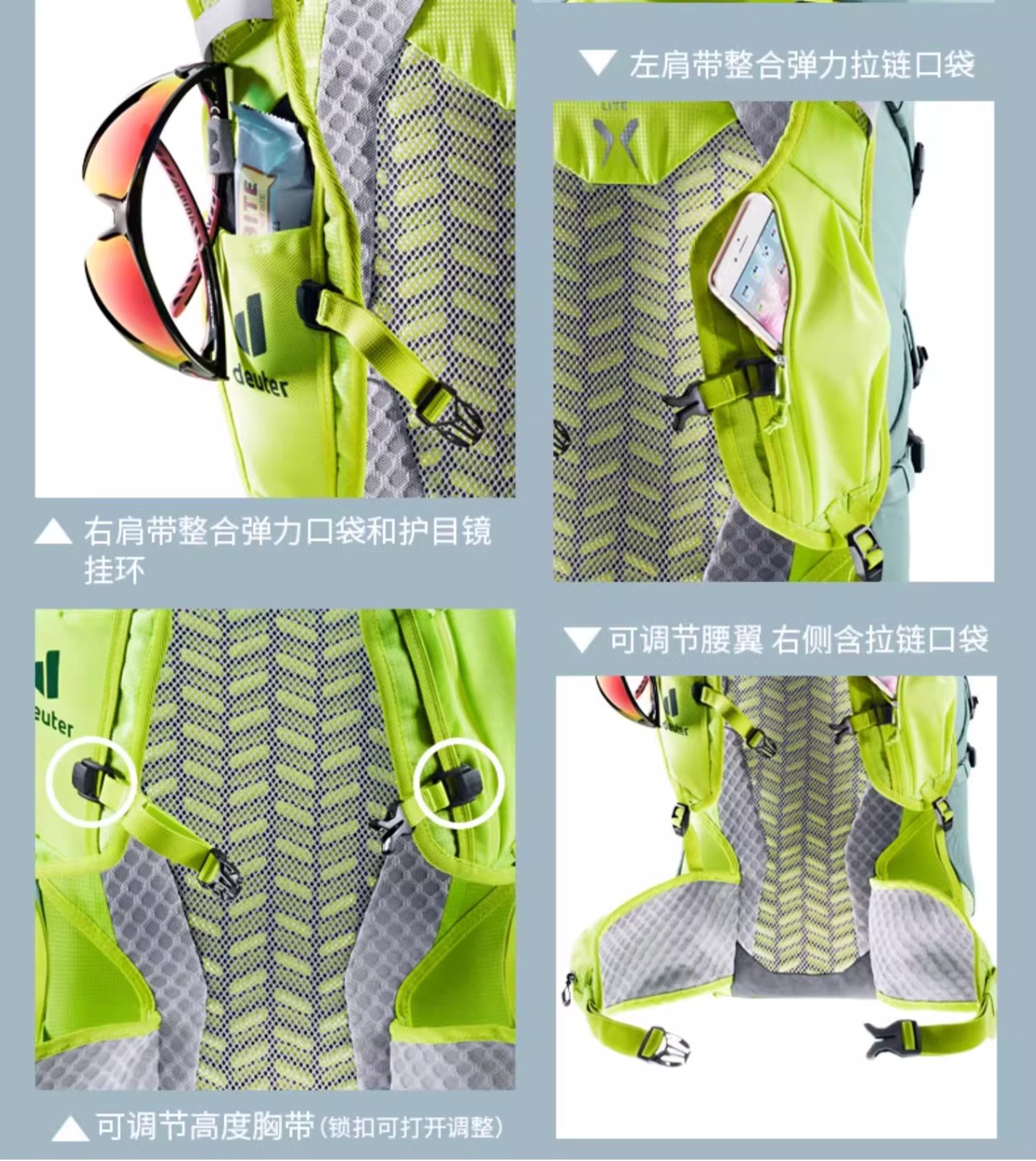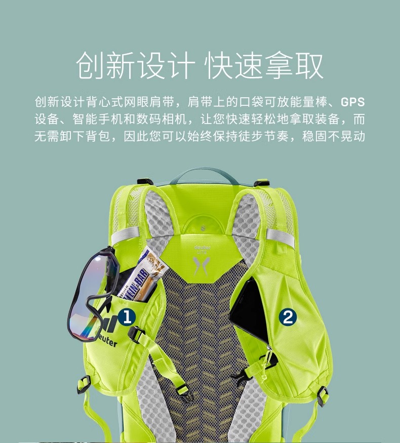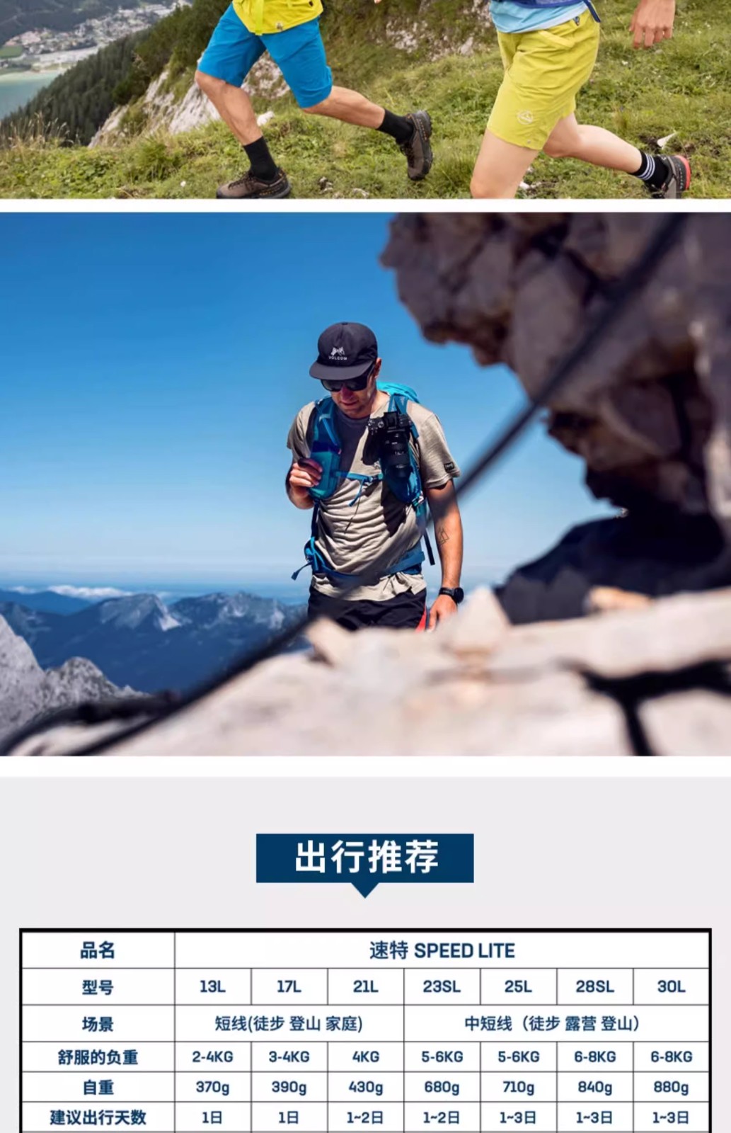 SPEED LITE 为快节奏的远足徒步和越野跑而设计,得益于Lite蜂巢背负系统、背心式网眼肩带、柔软的腰翼、可精准调节的胸带和可回收经 bluesign?认证的面料,侧面压缩带可有效减少负载摆动并实现全方位运动。肩带上的口袋可放置手机、GPS设备或数码相机,较大的物品可以存放在宽敞的盖子口袋中。
