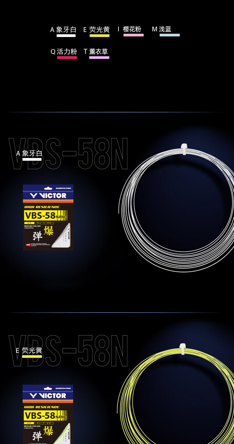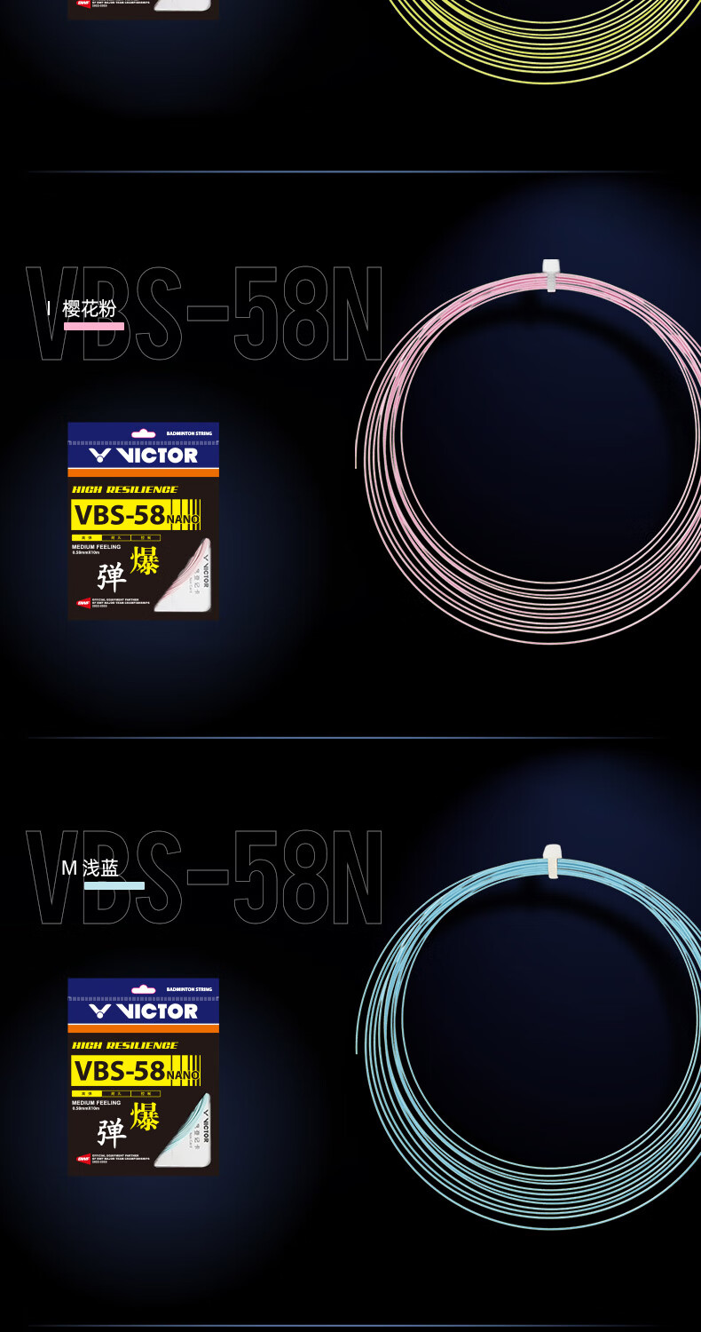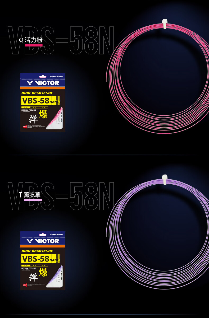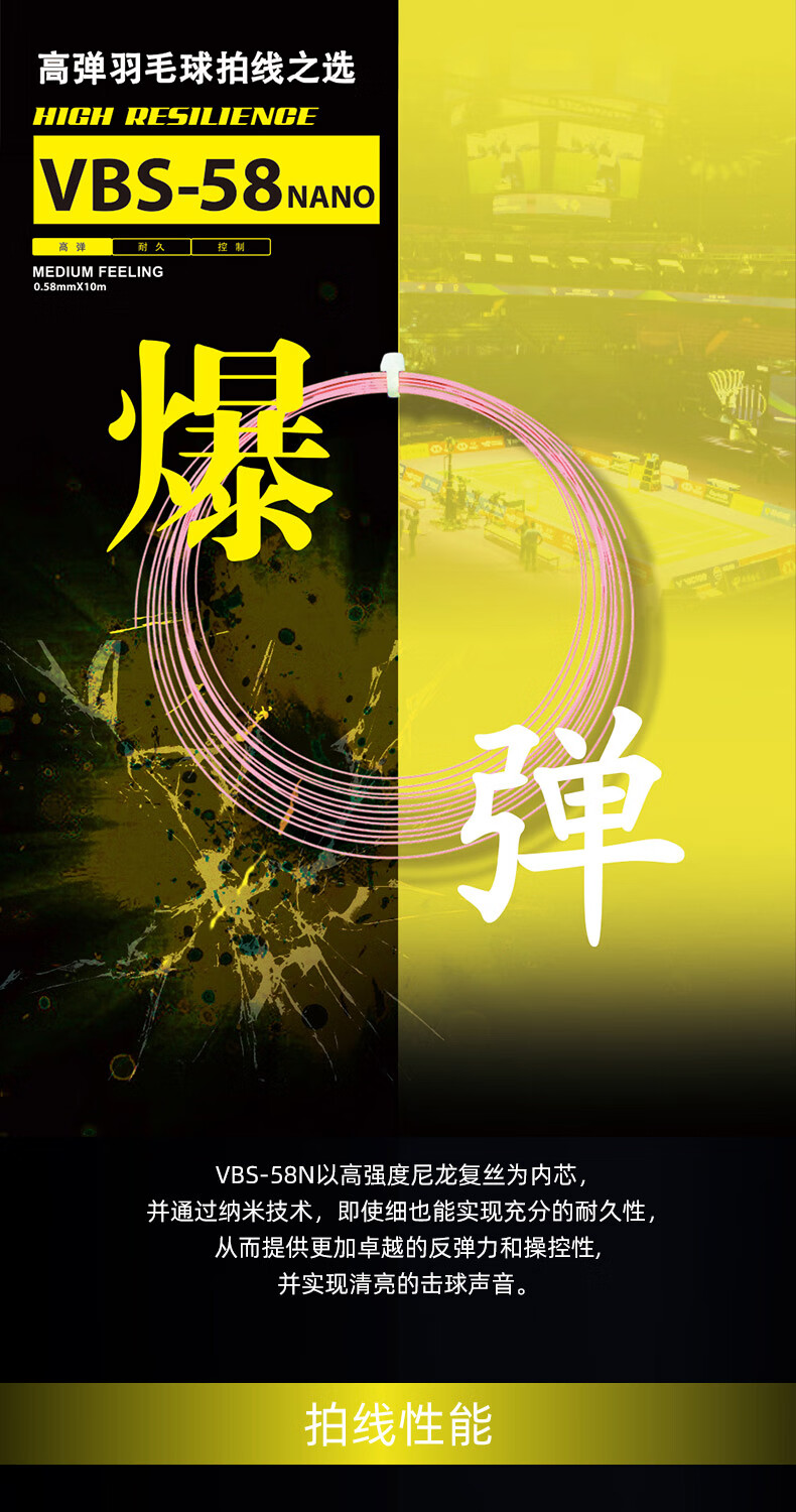 VBS-58N以高强度尼龙复丝为内芯并通过纳米技术,即使细也能实现充分的耐久性从而提供更加卓越的反弹力和操控性并实现清亮的击球声音。