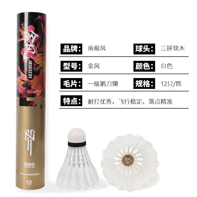 南极风 羽毛球 金风 比赛系列 鹅刀翎一二级 精品专业大赛级用球 12只/筒 耐打耐用 大赛级用球