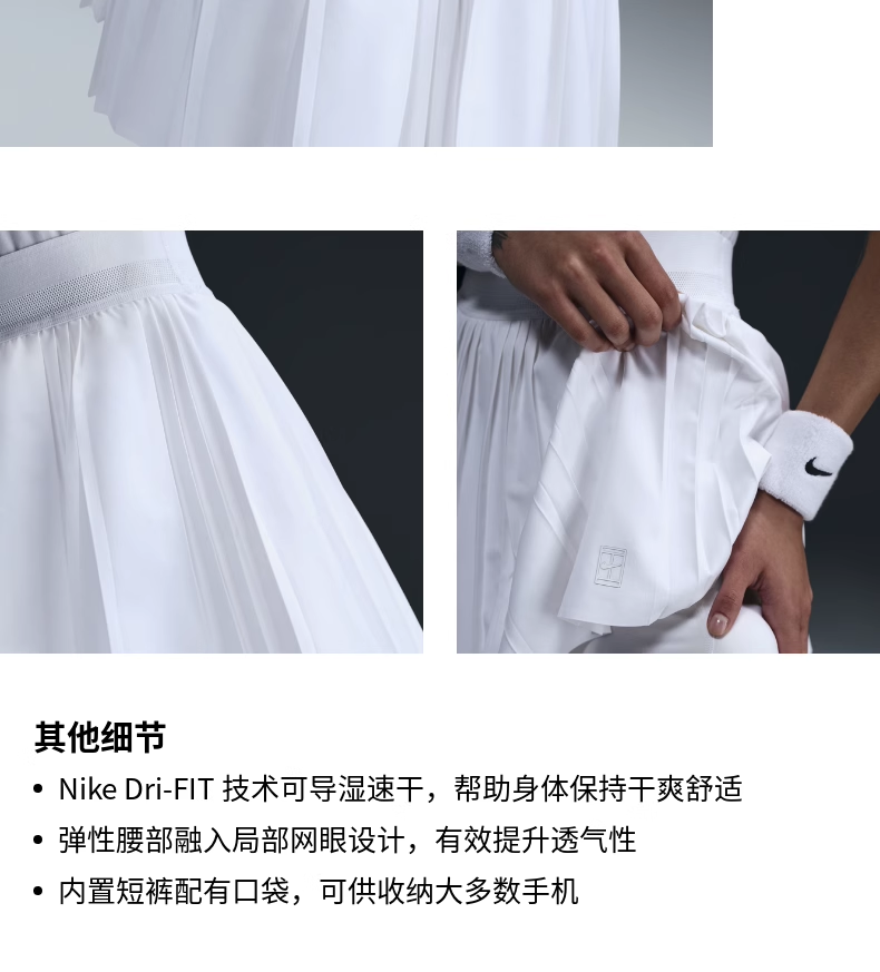 Nike耐克网球服 25温网新款TEAM系列网球裙百褶裙运动短裙 FZ6513-100 白色