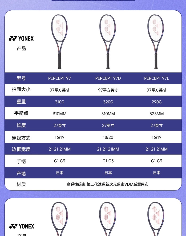 YONEX尤尼克斯网球拍 25新款PERCEPT 01PE97LYX瓦林卡全碳素专业拍 97/290 深藏青色