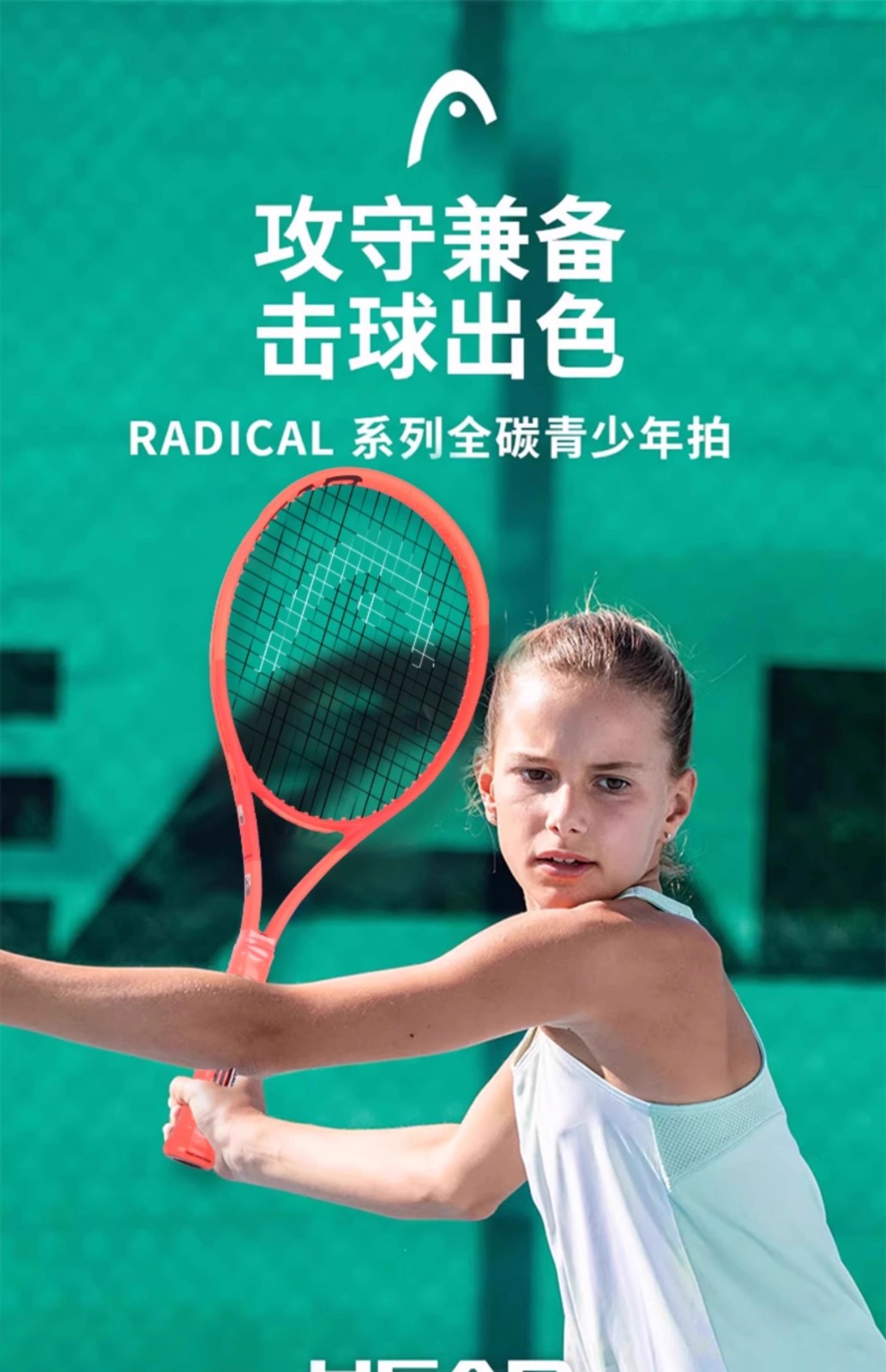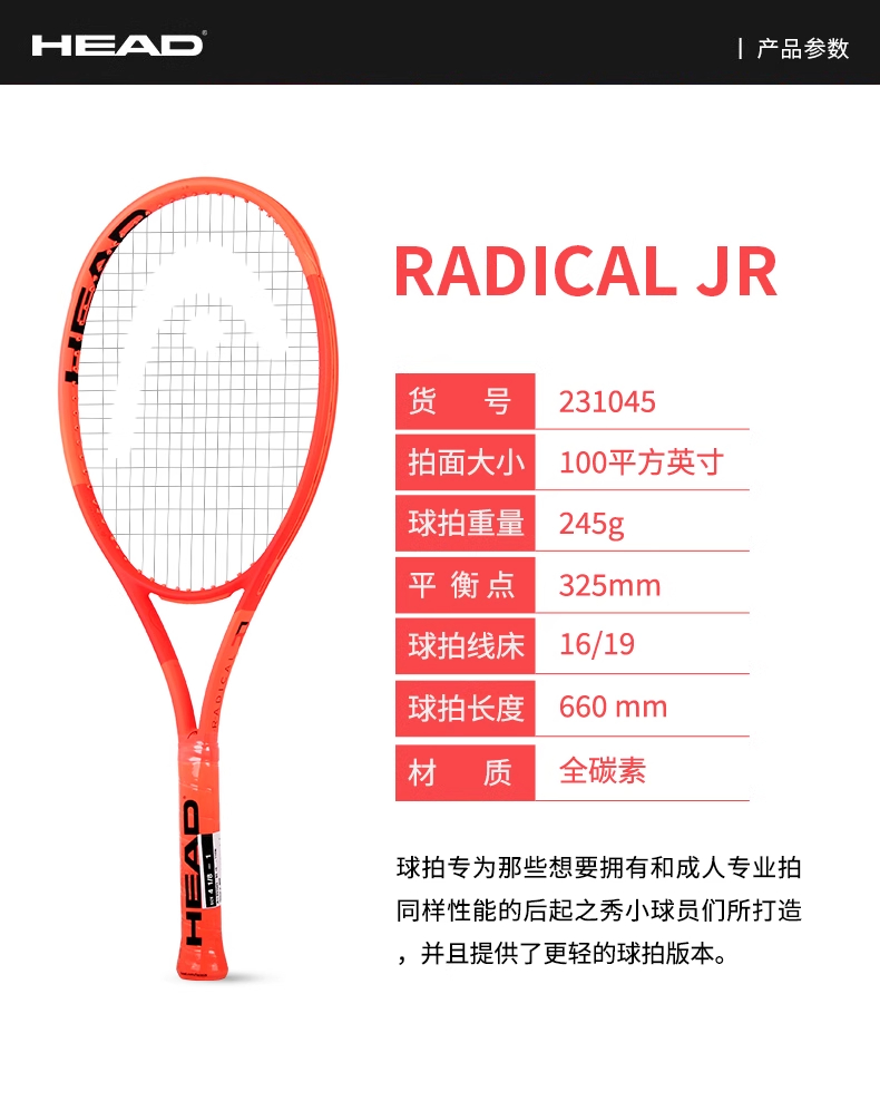 HEAD海德网球拍 儿童网球拍青少年网球拍全碳素儿童拍专业拍一体拍RADICAL JR26 26寸 100/245 231045