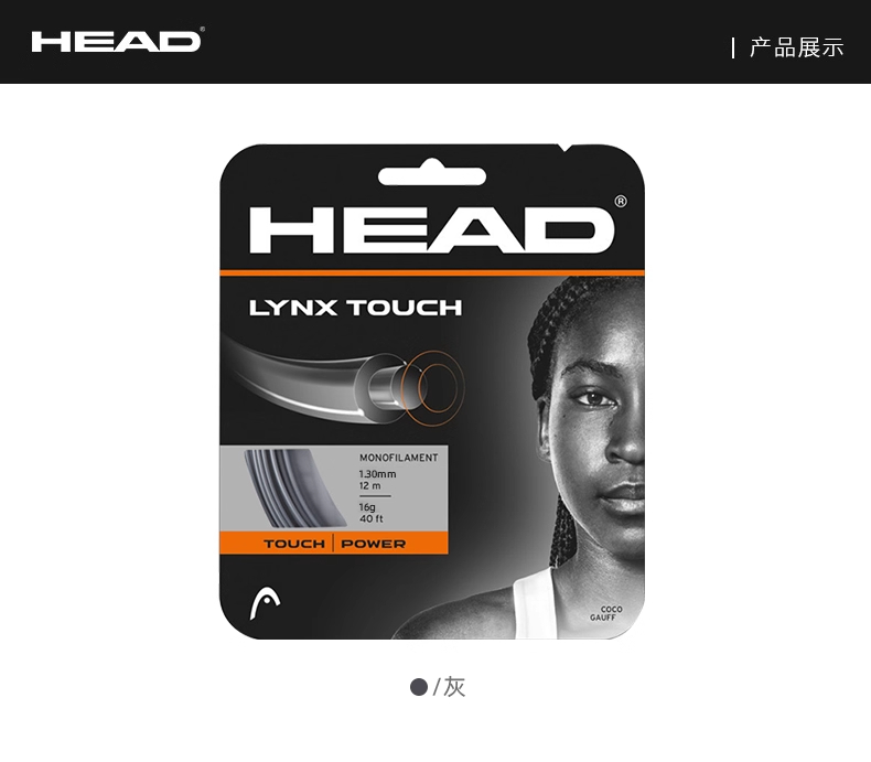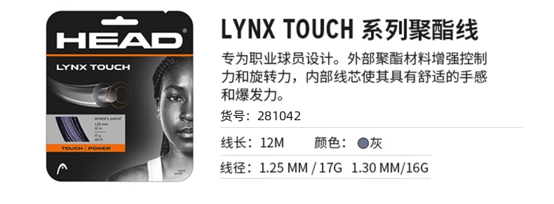 海德HEAD网球线 高芙同款LYNX TOUCH网球线聚酯线硬线网球拍线 281042 1.25MM 灰色
