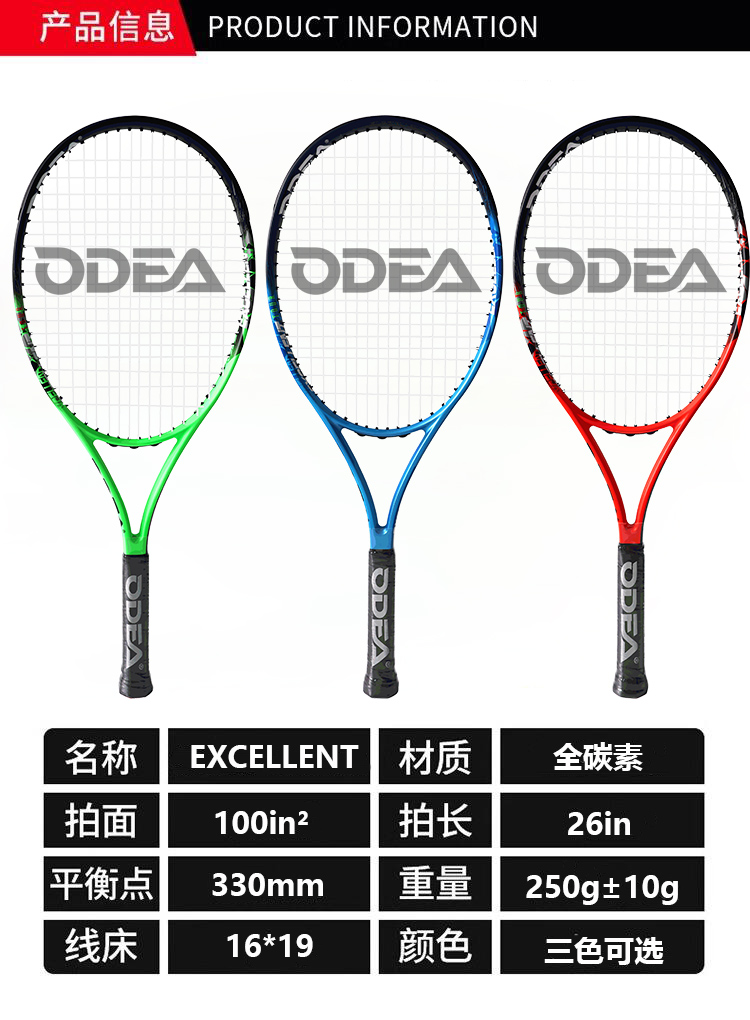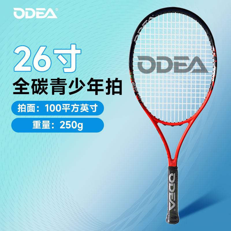 Odear欧帝尔网球拍 EXCELLENT系列初学入门拍全碳素成品拍已穿线26寸全碳青少年拍 100/250g 红/绿/蓝 三色可选